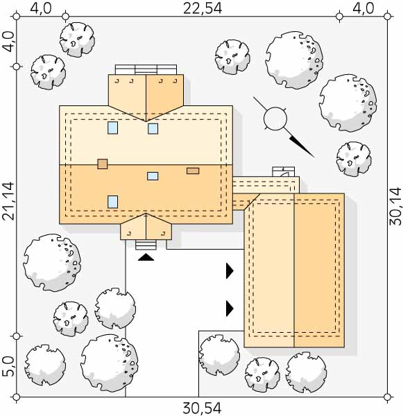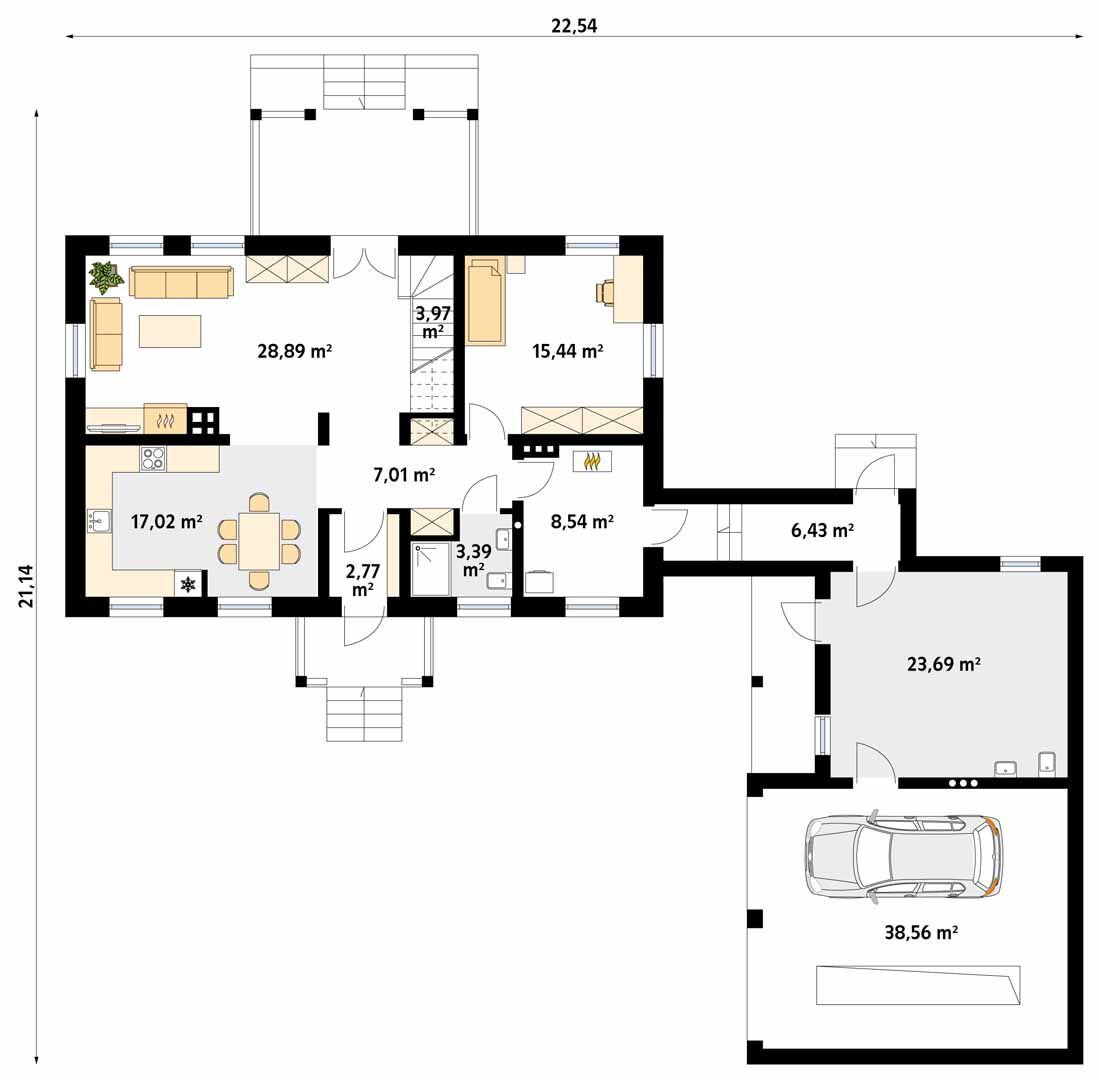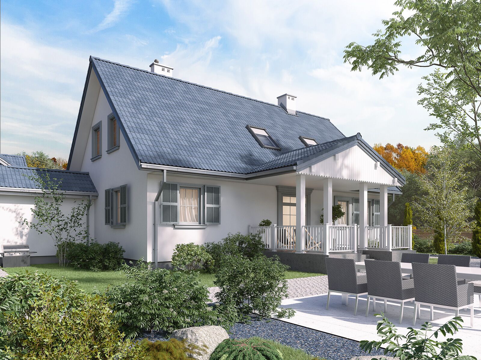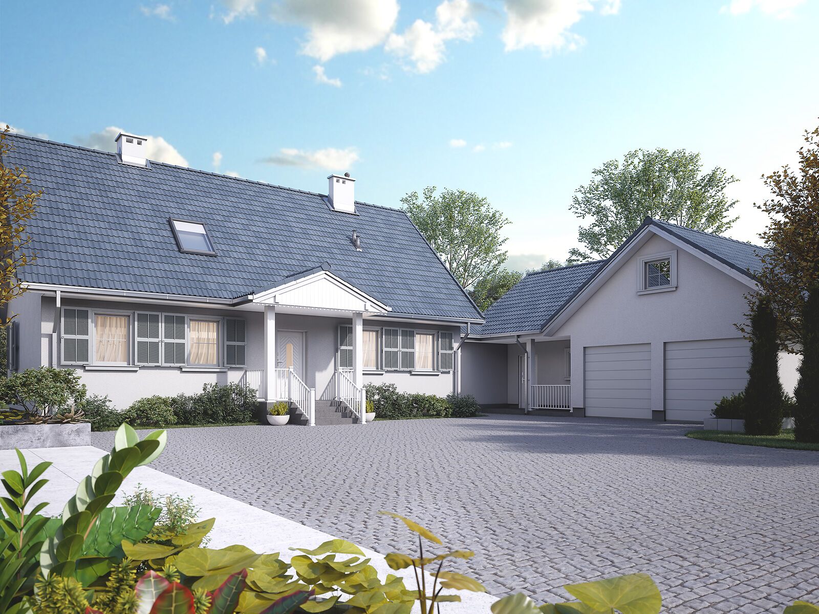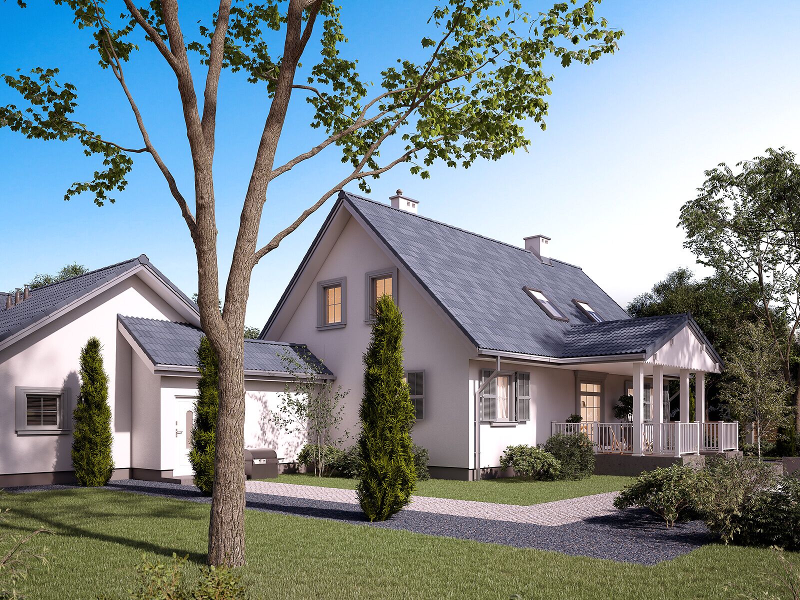 Szpak 2 to projekt domu z użytkowym poddaszem, którego część mieszkalna oraz gospodarcza zostały zaprojektowane w dwóch budynkach, połączonych ze sobą za pomocą łącznika. W części mieszkalnej na parterze znajduje się salon z wyjściem na zadaszony taras oraz kuchnia połączona z jadalnią. Dodatkowo na parterze znajduje się pokój mogący pełnić funkcję gabinetu lub sypialni gościnnej. Program funkcjonalny uzupełnia łazienka oraz kotłownia z wejściem do łącznika, który łączy część mieszkalną z gospodarczą. Na poddaszu zaprojektowano część nocną z trzema sypialniami, łazienką oraz garderobą. W części gospodarczej znajduje się dwustanowiskowy garaż z kanałem samochodowym. Z garażu przechodzimy do dużego pomieszczenia gospodarczego z dodatkowym wejściem od frontu budynku. W tej części znajduje się nieużytkowe poddasze, które może służyć jako strych.