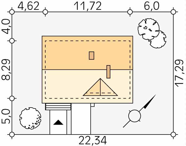 Wolno stojący domek z użytkowym poddaszem i całkowitym podpiwniczeniem. Niewielki, prosty w budowie dom dla 3 – 4 osób. Istnieje wersja domu letniskowego.