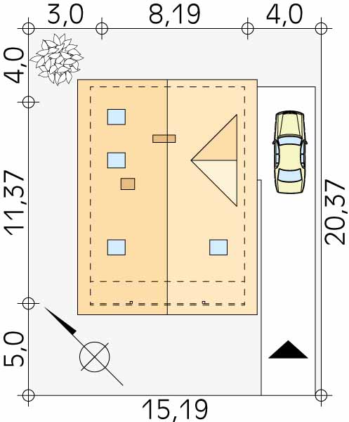 Niewielki dom jednorodzinny z użytkowym poddaszem. Prosty, funkcjonalny układ. Strefa prywatna zlokalizowana na poddaszu. Duży zadaszony taras.