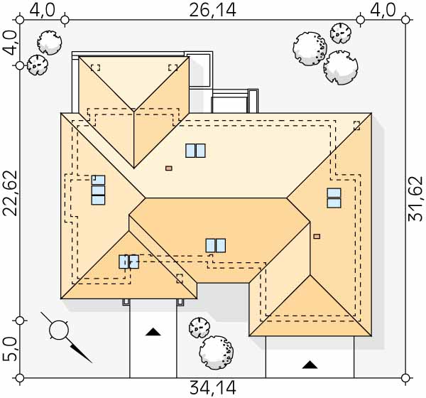 Tytan to projekt domu z użytkowym poddaszem, który zwraca uwagę imponującą powierzchnią użytkową wynoszącą niemal 500m2. Projekt odznacza się efektownym designem oraz oferuje komfortowy program użytkowy. Na parterze zaprojektowano rozbudowany układ funkcjonalny, na który składa się strefa dzienna, nocna oraz gospodarcza. W strefie dziennej znajduje się przestronny salon, duża jadalnia oraz wydzielona kuchnia ze spiżarnią, chłodnią oraz wyspą z miejscem do przyrządzania i spożywania posiłków. Charakteru dodają liczne przeszklenia, które idealnie doświetlają wnętrza naturalnym światłem. Z salonu znajduje się również wyjście na zadaszony taras, umożliwiający wypoczynek na świeżym powietrzu niezależnie od warunków pogodowych. Układ funkcjonalny na parterze uzupełnia strefa nocna, składająca się z dwóch sypialni z garderobą, dwóch łazienek oraz przestronnego holu, w którym zaprojektowano jednobiegowe schody prowadzące na poddasze. Na poddaszu zaprojektowano prywatną strefę gospodarzy, na którą składa się duża sypialnia z prywatną garderobą, łazienka, siłownia oraz dodatkowe pomieszczenia do dowolnej aranżacji. Uzupełnieniem programu funkcjonalnego jest obszerna strefa gospodarcza na parterze, w której znajduje się dwustanowiskowy garaż, pralnia, kotłownia oraz dwa pomieszczenia gospodarcze z dodatkowym wyjściem zewnętrznym.