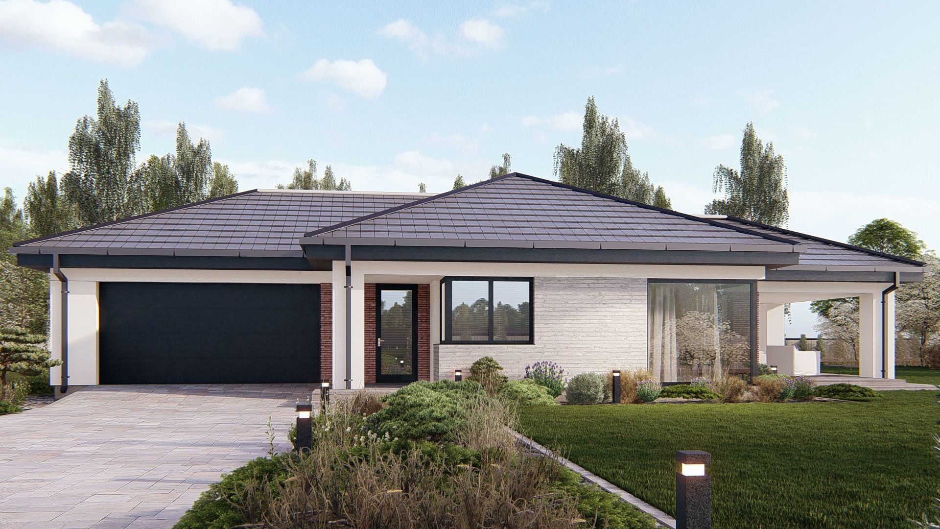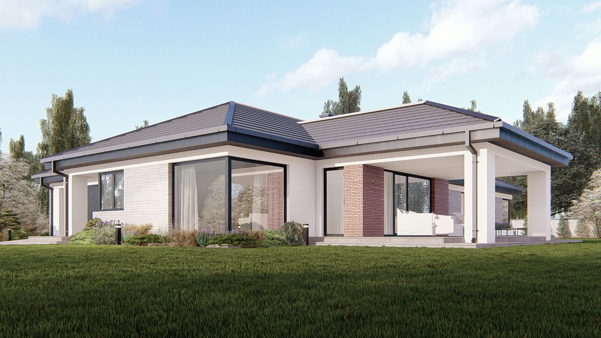Gotowy projekt domu uA104v1 jest to propozycja parterowego domu z reprezentacyjnym, zadaszony tarasem, który będzie idealnym miejscem do organizacji letnich przyjęć w ogrodzie. Ciekawa bryła z nowoczesnym wykończeniem przykryta została dachem wielospadowym. Ulokowanie całego programu funkcjonalnego na jednym poziomie, bez konieczności pokonywania schodów gwarantuje maksymalną wygodę użytkowania. Ten funkcjonalny i reprezentacyjny projekt domu o powierzchni użytkowej 202 m2 podzielony został na strefy dzienną i nocną. Do środka domu dostajemy się zadaszonym wejściem, po przekroczeniu, którego znajdujemy się w wiatrołapie z miejscem na szafę wnękową oraz przejściem do dwustanowiskowego garażu. W strefie dziennej zaplanowano półotwartą kuchnię oraz jasną jadalnię. Zarówno w kuchni, jak i w jadalni zaprojektowano narożne okna. Sercem domu jest reprezentacyjny salon z dużymi oknami oraz kominkiem. Dodatkowym udogodnieniem w tej części domu jest toaleta. W głębi domu znajduje się strefa prywatna- nocna a w niej master bedroom, czyli sypialnia z własną łazienką oraz garderobą, a także dwie sypialnie dla dzieci oraz gabinet. Każda z sypialni posiada duże okna i własny dostęp do tarasu. W tej strefie domu znajduje się ogólnodostępna łazienka z wanną i prysznicem oraz pralnia. Projekt uA104 jest to efektowany projekt dla wymagających inwestorów i ich rodzin. Na swojej powierzchni w funkcjonalny sposób łączy wszystko co niezbędne dla komfortowego mieszkania dla dużej rodziny. Projekt występuje również w pomniejszonym wariancie uA104.