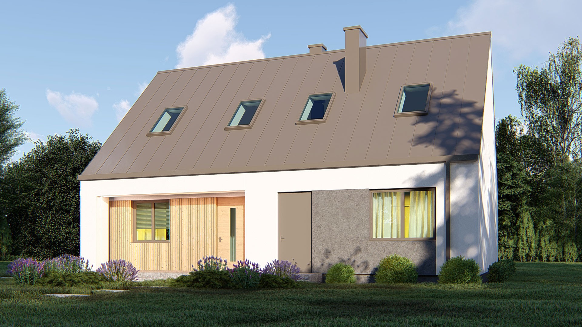 Projekt gotowy uA11v3 to kompaktowy w swych wymiarach oraz tani w budowie i późniejszym utrzymaniu dom parterowy. Utrzymany został w tradycyjnym stylu z dwuspadowym dachem o kącie nachylenia 45 stopni. Projekt ten zapewnia 85 m2 powierzchni użytkowej. Nieskomplikowana bryła pozwala szybko i tanio zrealizować budowę. Na elewacji zaproponowano kolorystykę nawiązującą do natury z elementami drewna, a na elewacji ogrodowej zaproponowano drewnianą pergolę, która wyznacza strefę relaksu na tarasie, jednocześnie zapewniając cień i ochronę przed deszczem. Projekt ten posiada bardzo wyraźny podział na strefę dzienną i nocną. Po wejściu do domu znajdujemy się w wiatrołapie, z którego prawej strony znajduje się pomieszczenie gospodarcze. Po przejściu do strefy dziennej znajdujemy się w salonie z jadalnią i otwartą kuchnią. W salonie architekt zaplanował schody, które prowadzą na strych. W części nocnej znajdują się dwie sypialnie i spora łazienka ogólnodostępna. Ten dom w cenie mieszkania doskonale sprawdzi się jako miejsce zamieszkania dla pary lub rodziny z dzieckiem. Ten lubiany przez inwestorów projekt występuje w naszej ofercie w wielu wariantach: uA11, uA11v1 oraz uA11v2 ( z poddaszem użytkowym).
