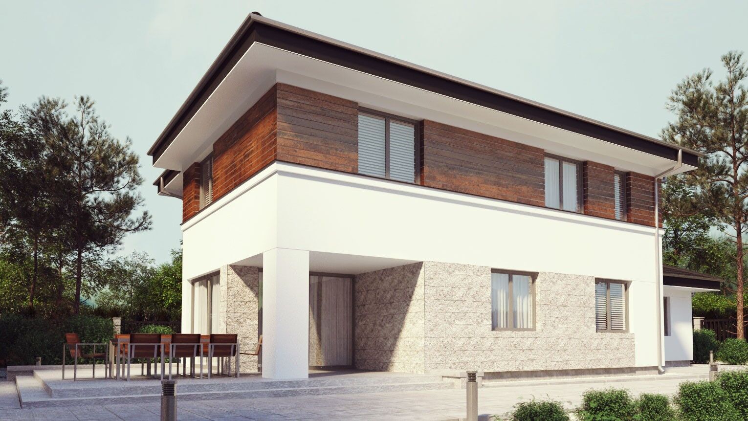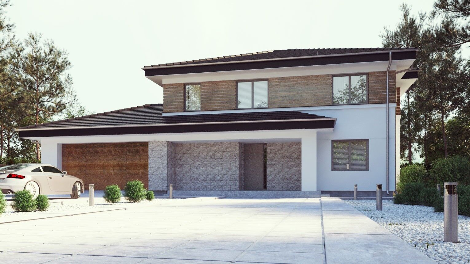 uA123 jest to projekt gotowy domu piętrowego o prostej bryle w tradycyjnym stylu z dachem wielospadowym. Projekt ten ma 159 m2 powierzchni użytkowej, na której mieści się wszystko co potrzebne do komfortowego mieszkania. Wyjątkowego charakteru temu projektowi domu nadaje ciekawy dobór materiałów zastosowanych na elewacjach. Ideą tego projektu było uzyskanie wygodnej w użytkowaniu i ergonomicznej bryły, która zarazem będzie ciekawym punktem w przestrzeni. Pełne piętro, boczny garaż dwustanowiskowy z przejściem do domu oraz dodatkowy pokój na dole to atuty tego projektu domu. Po przekroczeniu drzwi wejściowych znajdujemy się w wiatrołapie, który prowadzi do otwartej przestrzeni, w której zlokalizowano przestronny i jasny salon z jadalnią oraz kuchnię ze spiżarnią. Na parterze zaprojektowano również toaletę oraz gabinet. Duża ilość przeszkleń zastosowanych na parterze zapewnia dostęp światła do wnętrza optycznie je powiększając, a jednocześnie otwiera dom na ogród, zapraszając zieleń do środka. Niewątpliwą zaletą tego projektu domu jest również narożny, częściowo zadaszony, okazały taras, który będzie idealnym miejscem do organizacji letnich przyjęć w ogrodzie. Na piętrze znajdują się cztery sypialnie, w tym jedna z garderobą oraz wygodna łazienka z oddzieloną praktyczną pralnią. uA123 to idealna propozycja dla rodziny z dziećmi, która szuka wygodnego i komfortowego domu na lata.