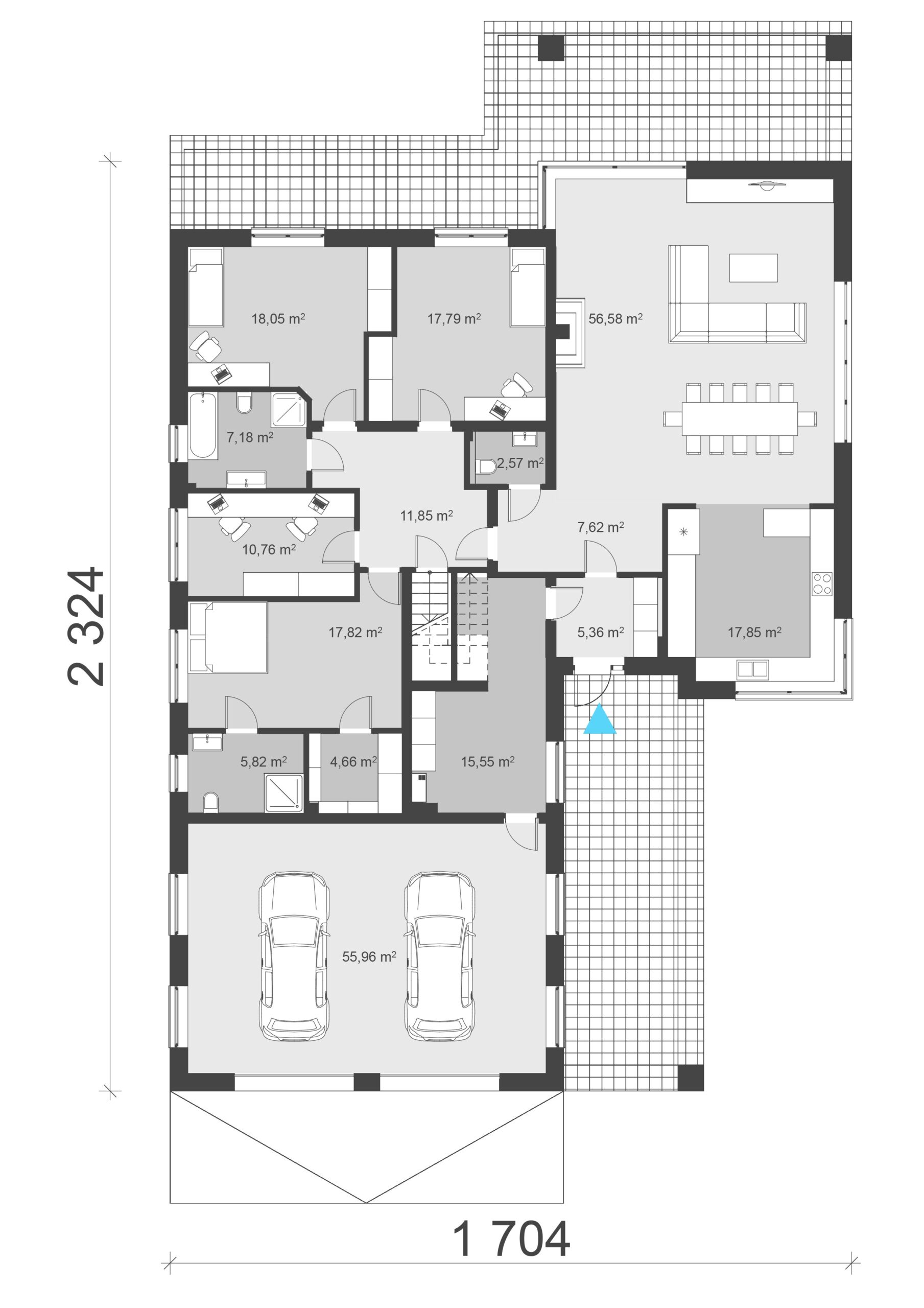 Szukasz idealnego domu parterowego, który zaspokoi twoje wysokie wymagania i potrzeby? Właśnie go znalazłeś. Projekt uA142 jest to wygodny i funkcjonalny dom parterowy, zaprojektowany w przemyślany sposób. Dom został przykryty kopertowym dachem, a część garażowa została wysunięta do przodu. W projekcie zaplanowano duży i wygodny w użyciu garaż na dwa auta, który z powodzeniem pomieści też inne domowe sprzęty. Do środka domu dostajemy się reprezentacyjnym wejściem z betonową pergolą. Z wiatrołapu mamy dostęp poprzez pomieszczenie gospodarcze do garażu. Jest to bardzo komfortowe rozwiązanie szczególnie jesienią i zimą, kiedy to nie musimy wychodzić na zewnątrz domu, żeby dostać się do auta. W projekcie zaplanowano przestronny, jasny salon z jadalną i kominkiem, będący sercem domu. W salonie zaprojektowano narożne okno, które pełni funkcję wyjścia na zadaszony taras. Taras będzie idealnym miejscem do organizacji letnich przyjęć w ogrodzie. W części dziennej znajduje się także duża, półotwarta kuchnia oraz toaleta. Część dzienna od nocnej została odseparowana za pomocą drzwi. W strefie prywatnej domowników zaplanowano trzy sypialnie, w tym jedna master bedroom z łazienką i garderobą, gabinet oraz ogólnodostępną łazienkę z wanną i prysznicem. W projekcie tym ulokowano również schody, które zapewniają dostęp do strychu. Powierzchnia użytkowa tego projektu to 183 m2. Projekt uA142 występuje również w wariancie 142v1 .
