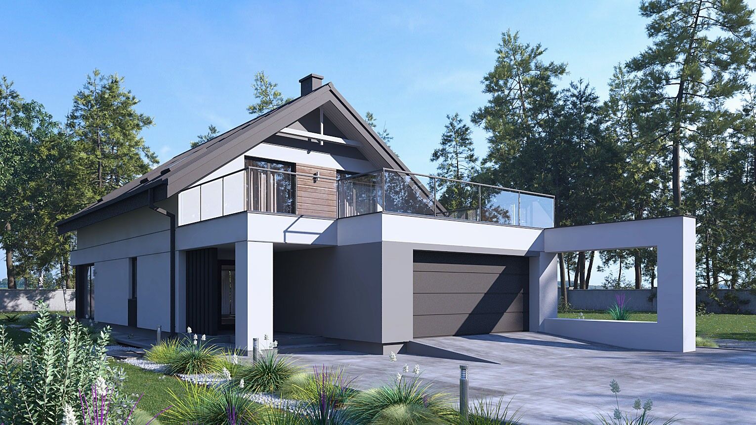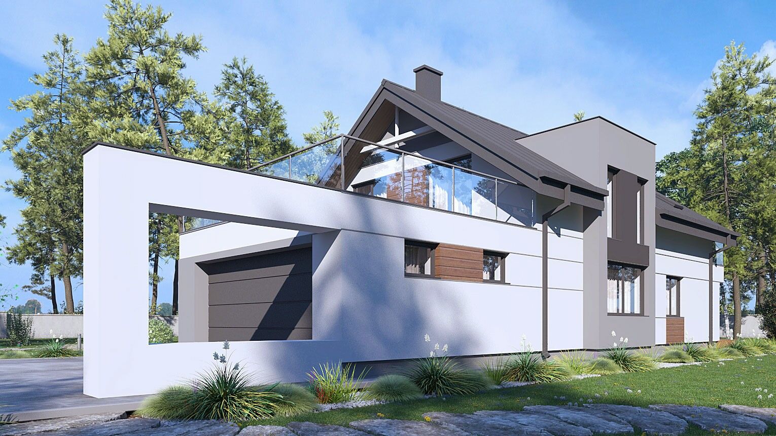 Projekt domu uA151 jest to tradycyjny projekt domu w nowoczesnym wydaniu. Wyjątkowego charakteru nadaje mu ciekawa betonowa pergola znajdująca się na elewacji frontowej przy wjeździe do garażu. Ten gotowy projekt domu o powierzchni użytkowej 158 m2 przykryty został dachem dwuspadowym. W bryle znajduje się wysunięty do przodu dwustanowiskowy garaż, nad którym zaplanowano okazały taras. W części garażowej, która połączona jest przejściem z częścią mieszkalną domu zaprojektowano sporych rozmiarów pomieszczenie gospodarcze. Do środka domu dostajemy się poprzez zadaszone wejście, które prowadzi do wiatrołapu. Parter stanowi strefę dzienną, w skład której wchodzi salon z dużymi przeszkleniami i kominkiem będący sercem domu. W salonie znajduje się wyjście na taras, który jest doskonałym miejscem do wypoczynku w letnie dni. W tej strefie znajduje się także jadalnia z odrębną kuchnią, spiżarnia, dodatkowy pokój, który służyć może jako gabinet lub pokój gościnny oraz łazienka z toaletą i prysznicem. Na piętrze, w strefie nocnej zaprojektowano cztery wygodne sypialnie w tym jedna z garderobą, łazienkę ogólnodostępną oraz praktyczną pralnię. Każda z sypialni ma dostęp do balkonu od strony ogrodu lub tarasu od frontu budynku. Projekt uA151 cechuje wysoka funkcjonalność w układzie pomieszczeń. Przemyślany rozkład poszczególnych funkcji gwarantuje komfort mieszkania przez lata. Projekt uA151 powstał z myślą o dużej rodzinie, która szuka projektu łączącego w sobie nowoczesny styl z wygodą mieszkania.