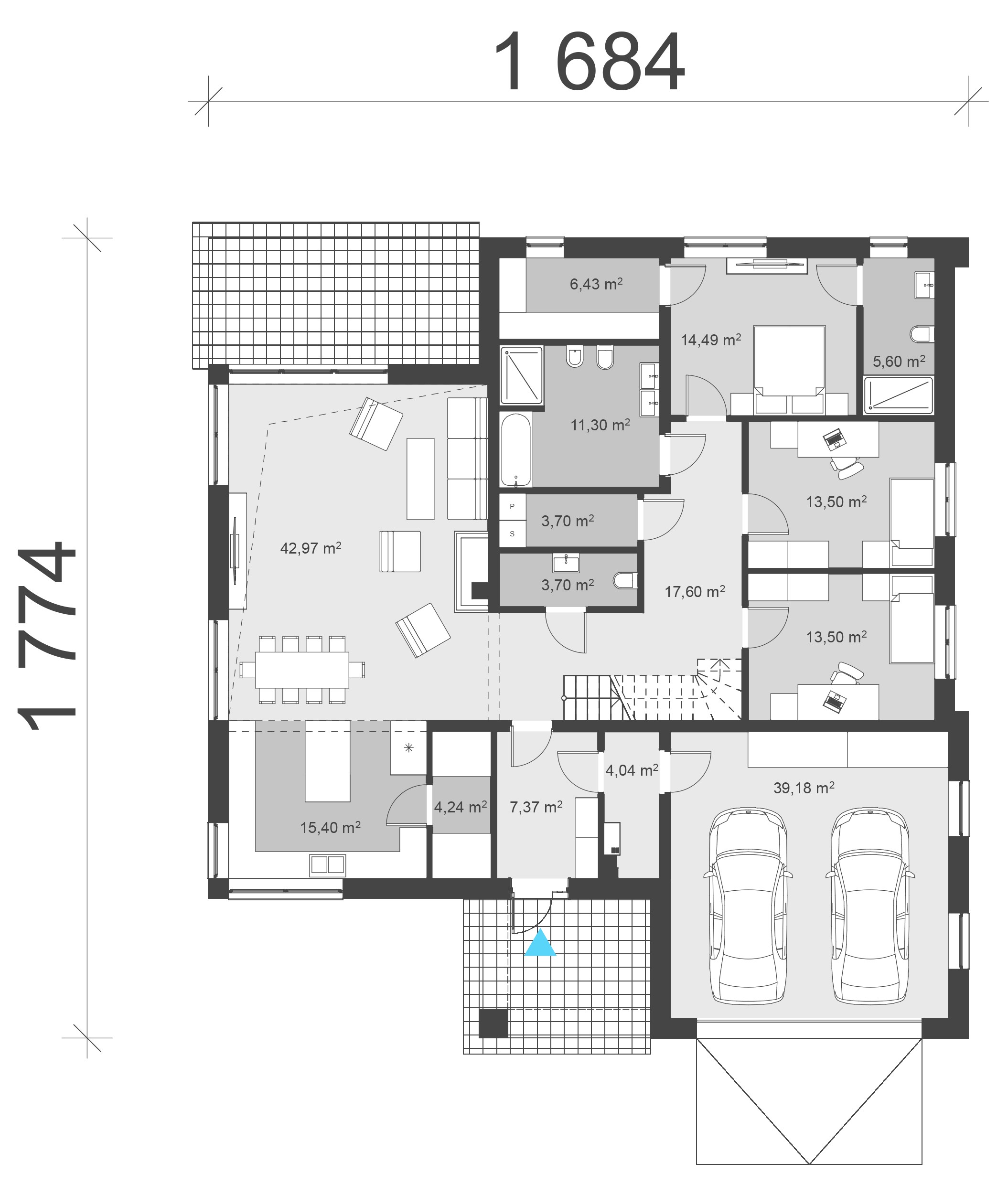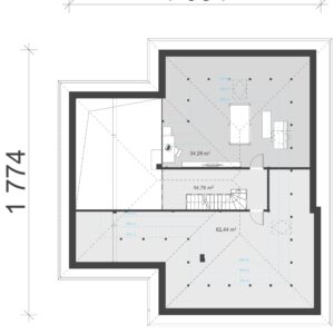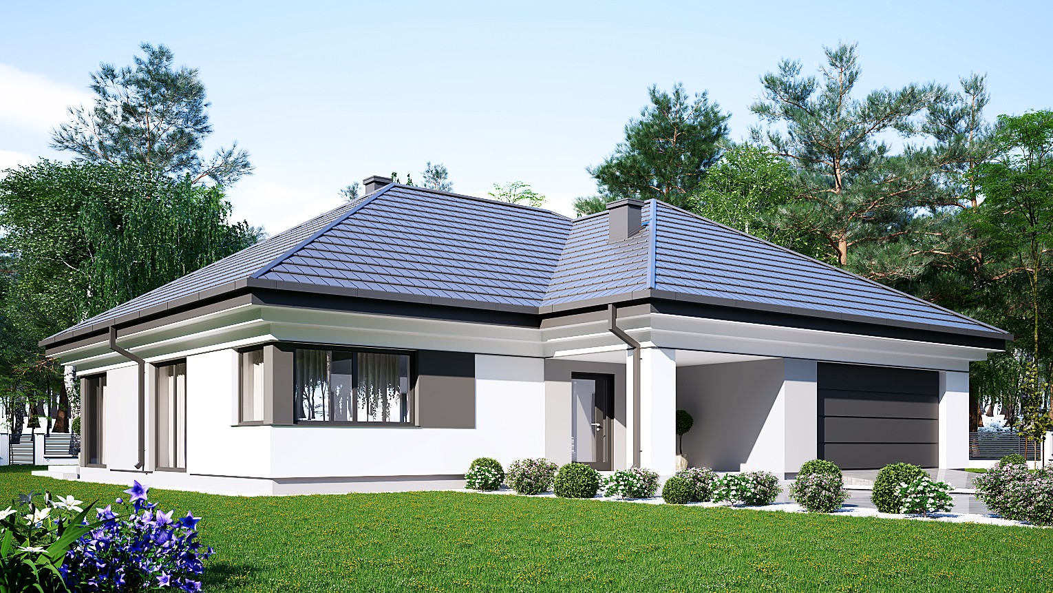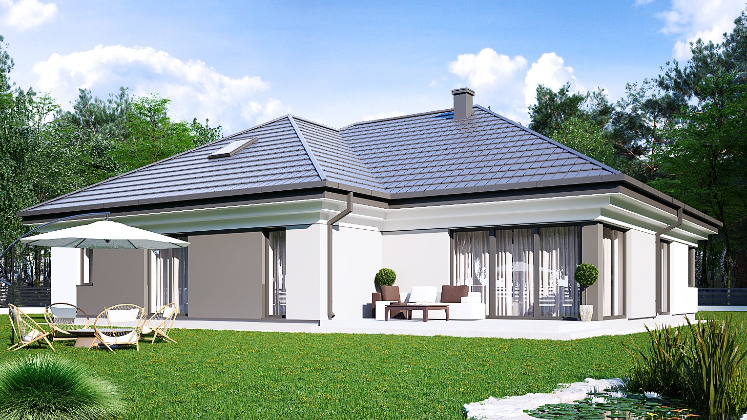Gotowy projekt domu uA196 jest to wygodny w mieszkaniu i funkcjonalny dom parterowy o powierzchni użytkowej mieszkalnej 200m2. Na zewnątrz utrzymany jest w estetycznej biało- szarej kolorystyce i przykryty dachem wielospadowym. Do środka domu prowadzi zadaszone wejście, po przekroczeniu, którego znajdujemy się w wiatrołapie. Przy wiatrołapie wydzielono pomieszczenie gospodarcze, które pełni funkcję łącznika części mieszkalnej domu z dwustanowiskowym garażem. W wewnętrznym układzie funkcjonalnym widać wyraźny podział na strefy dzienną (lewa strona domu) oraz nocną ( prawa strona domu). W strefie dziennej- ogólnodostępnej projektant zaplanował przestronny, duży i wysoki salon z jadalnią i kominkiem, a także wygodną kuchnię z praktyczną spiżarnią, w której doskonale odnajdzie się każdy pasjonat gotowania. W strefie nocnej- prywatnej zaprojektowano trzy wygodne i ustawne sypialnie, w tym jedna master bedroom z łazienką i garderobą, duża łazienkę główną z wanną i prysznicem oraz osobną pralnię. W korytarzu zaplanowano schody prowadzące na poddasze, gdzie wydzielono jeden dodatkowy pokój, który służyć może jako pokój do pracy lub bawialnię dla dzieci oraz strych, który pomieści wiele domowych sprzętów i przedmiotów. Dzięki zaplanowaniu całości programu funkcjonalnego na jednym poziomie projekt ten jest funkcjonalny oraz komfortowy w użytkowaniu. Optymalna organizacja funkcji w układzie przestrzennym tego gotowego projektu domu to gwarancja wygodnego mieszkania przez długie lata.