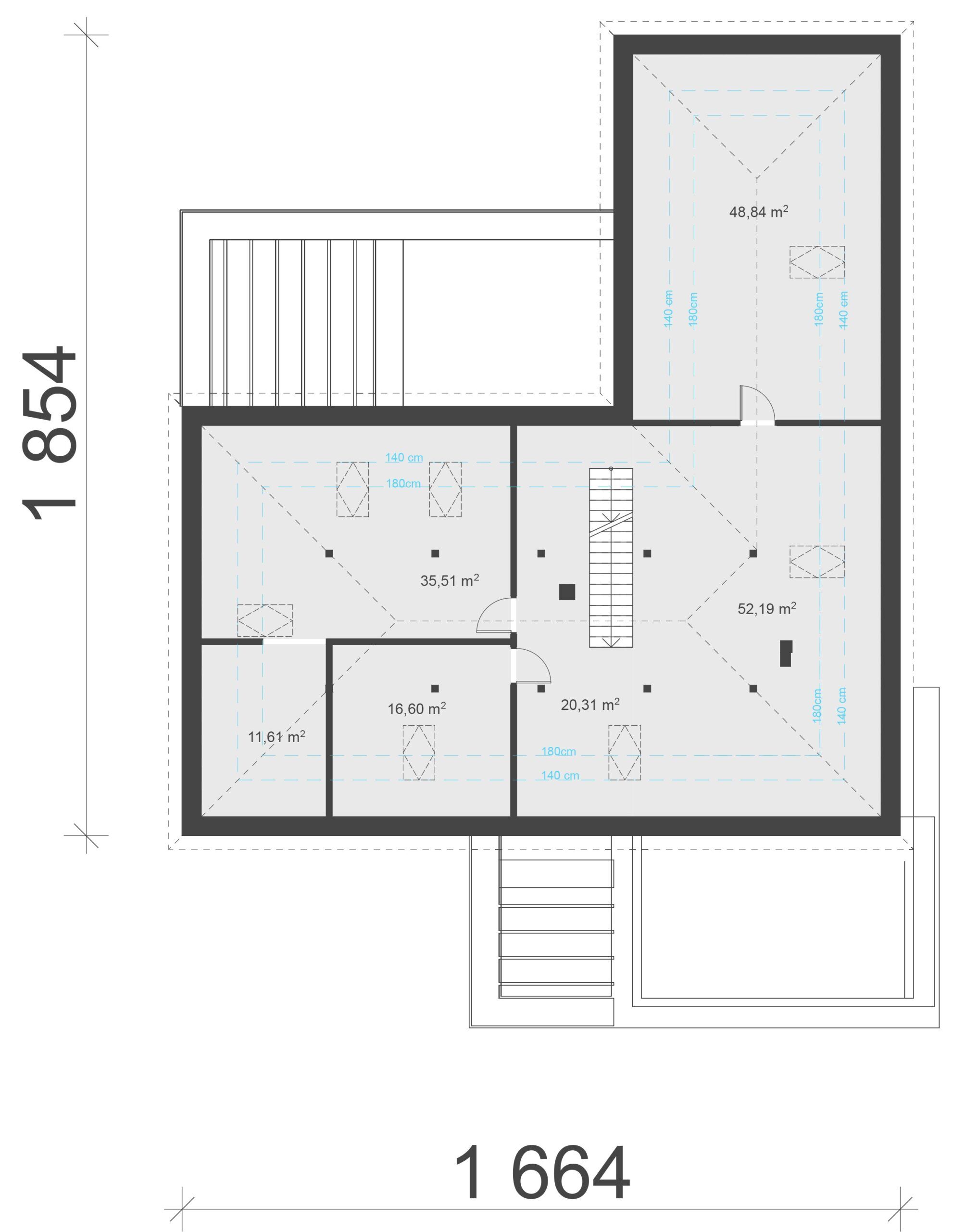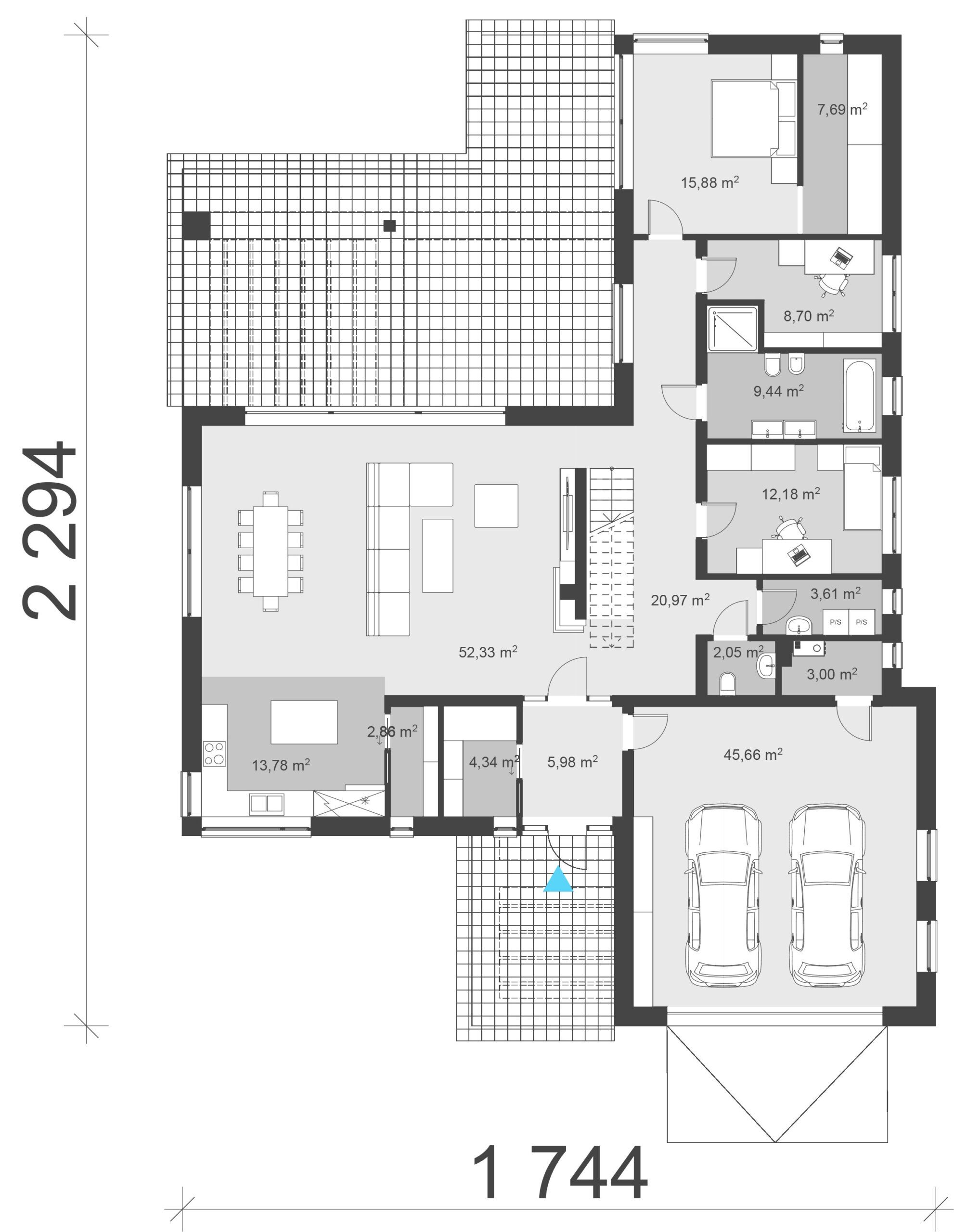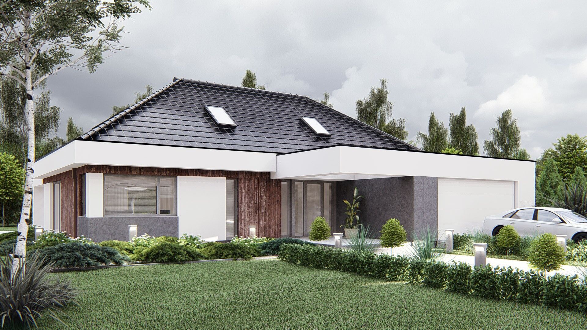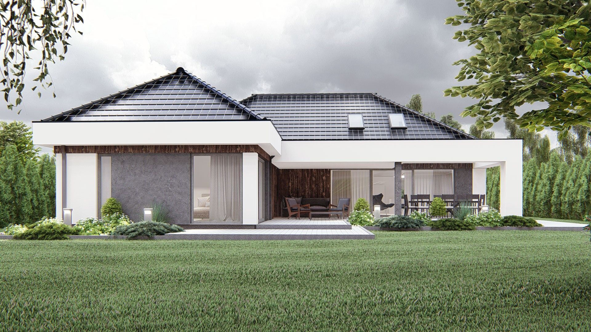 Gotowy projekt domu uA237 jest to godna uwagi propozycja nowoczesnego, parterowego projektu domu z możliwością adaptacji poddasza– projekt uA237 #uA237. Jasne wnętrza z dużymi przeszkleniami zapewniają poczucie przestrzeni a betonowa pergola na tarasie wyznacza zewnętrzną stefę relaksu domowników.
