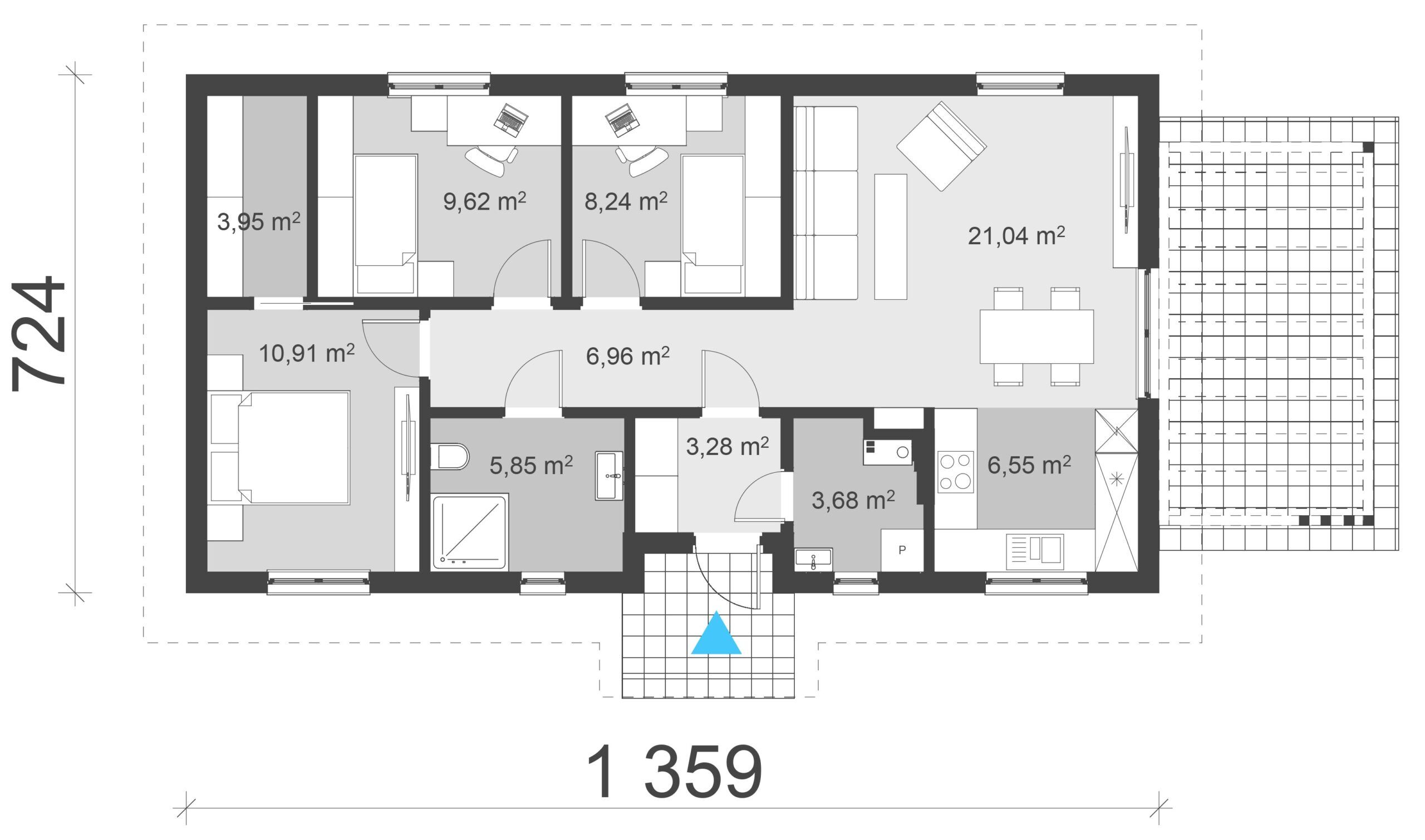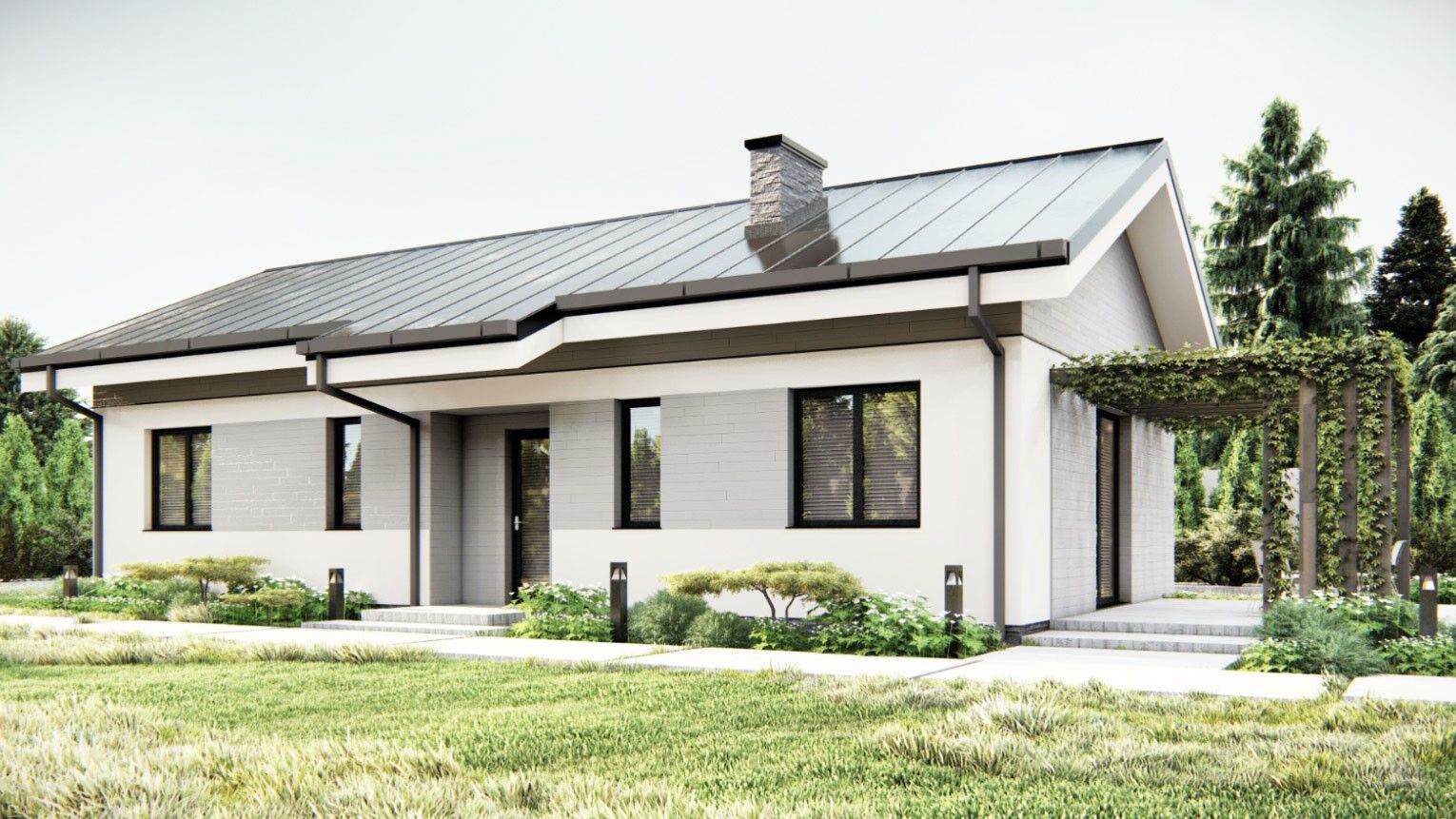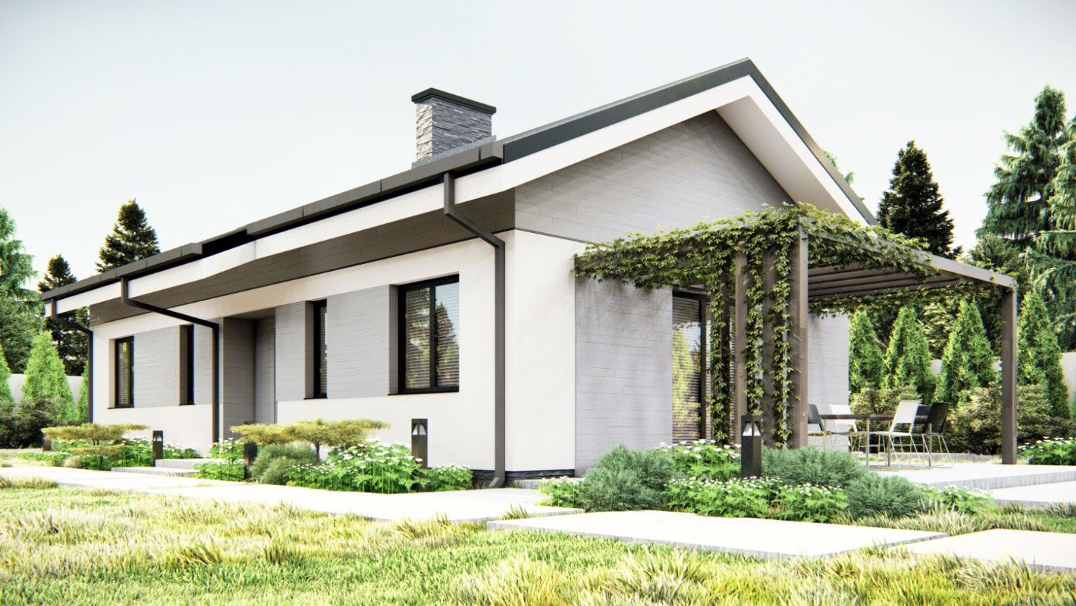 Gotowy projekt domu uA242 jest projektem domu parterowego taniego i szybkiego w budowie i późniejszej eksploatacji o powierzchni użytkowej mieszkalnej niespełna 80m2. Prosta bryła z dwuspadowym dachem utrzymana została w estetycznej biało-szarej kolorystyce. W wewnętrznym układzie funkcjonalnym po prawo od wejścia znajduje się pomieszczenie gospodarcze. Lewa strona domu została zagospodarowana na część sypialnianą. Master bedroom ma dołączoną garderobę. W tej części została zaprojektowana łazienka, do której jest łatwy dostęp z każdego pokoju. Pozostałą część domu zajmuje strefa dzienna czyli salon oraz kuchnia. W salonie uwzględniono również jadalnię oraz wyjście na przestronny taras. Kuchnię zaprojektowano na planie litery U. Atutem tego gotowego projektu domu jest drewniana pergola nad tarasem, która dodaje budynkowi uroku oraz funkcjonalności. Projekt jest świetnym rozwiązaniem dla 4 osobowej rodziny ze względu na niskie koszty budowy i funkcjonalny rozkład pomieszczeń.