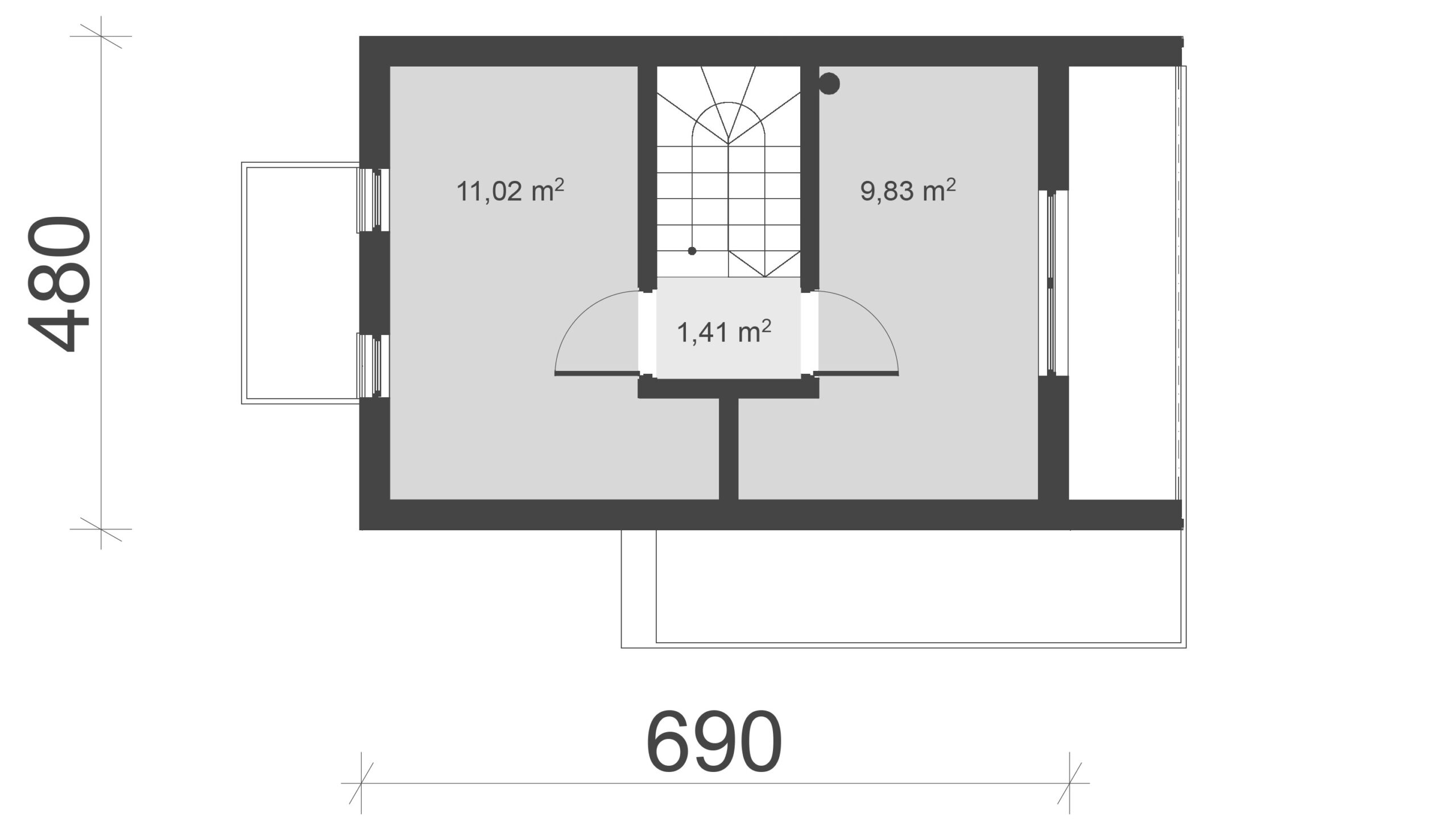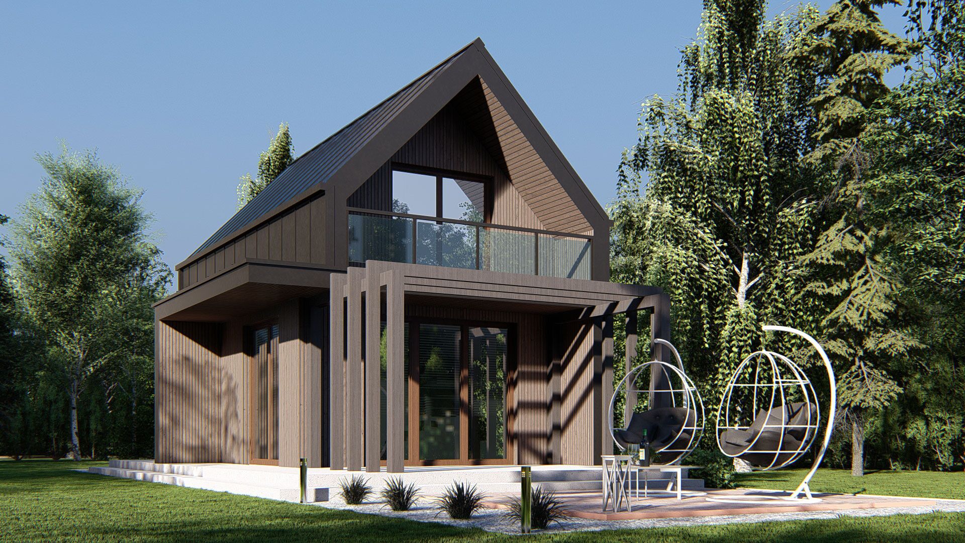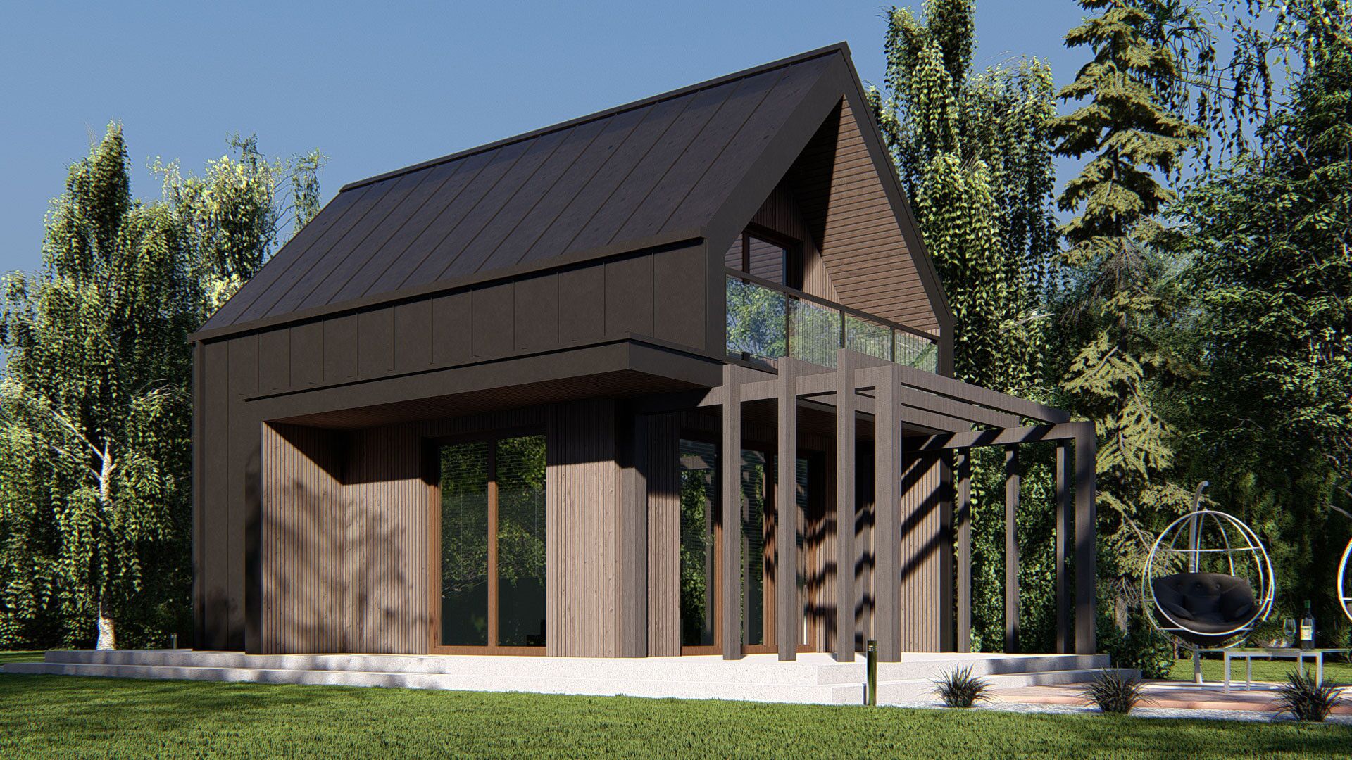 Nowoczesny dom całoroczny w konstrukcji drewnianej – szkieletowej uA283v1. Prosty, tani i szybki w budowie do 35m2- bez zbędnych formalności i pozwolenia na budowę. Prosta forma stodoły z dwuspadowym dachem urozmaicona została nowoczesnym w swej formie zadaszeniem nad wejściem głównym oraz drewnianą pergolą na tarasie. Elewacja zewnętrzna to ciekawe i efektowne połączenie grafitowej blachy w rąbek z naturalną, drewnianą okładziną. Na parterze znajduje się otwarta strefa z wydzieloną łazienką z prysznicem a na poddaszu dwie sypialnie. Idealny domek na działkę na weekendowe wypady lub jako dom całoroczny dla pary lub singla. Projekt występuje również w wersji podstawowej uA283.