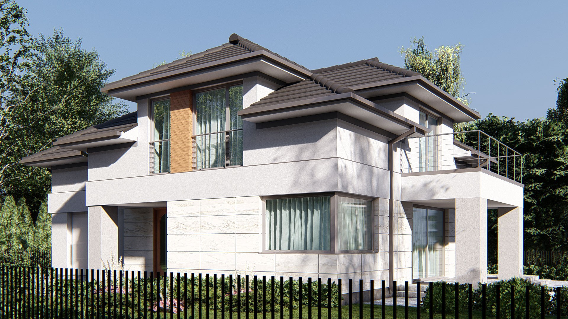 Gotowy projekt domu uA290 jest to klasyczny projekt domu w nowoczesnym wydaniu. Dom z wysokim poddaszem użytkowym, dzięki czemu jego strefa nocna jest bardziej funkcjonalna i wygodna w mieszkaniu. Na zewnątrz utrzymany w jasno szarej tonacji kolorystycznej z drewnianymi detalami. W bryle zaplanowano garaż na jedno auto. Część mieszkalna podzielona została na strefy dzienną i nocną. Strefa dzienna na parterze to wspólna strefa domowników w skład w której znajduje się kuchnia z wyspą kuchenną oraz podręczną spiżarnią. Salon połączony z jadalnią i wyjściem na taras to miejsce idealne do wieczornego, rodzinnego odpoczynku. Na parterze znajduje się także idealny do pracy gabinet oraz niewielka łazienka z toaletą oraz prysznicem. Na poddaszu domownicy mają do dyspozycji trzy komfortowe sypialnie z garderobami, ogólnodostępną łazienkę wyposażoną w wannę i prysznic oraz osobne pomieszczenie prani. Projekt uA290 powstał z myślą o rodzinie 2+2, która ceni sobie komfort i wygodę mieszkania.