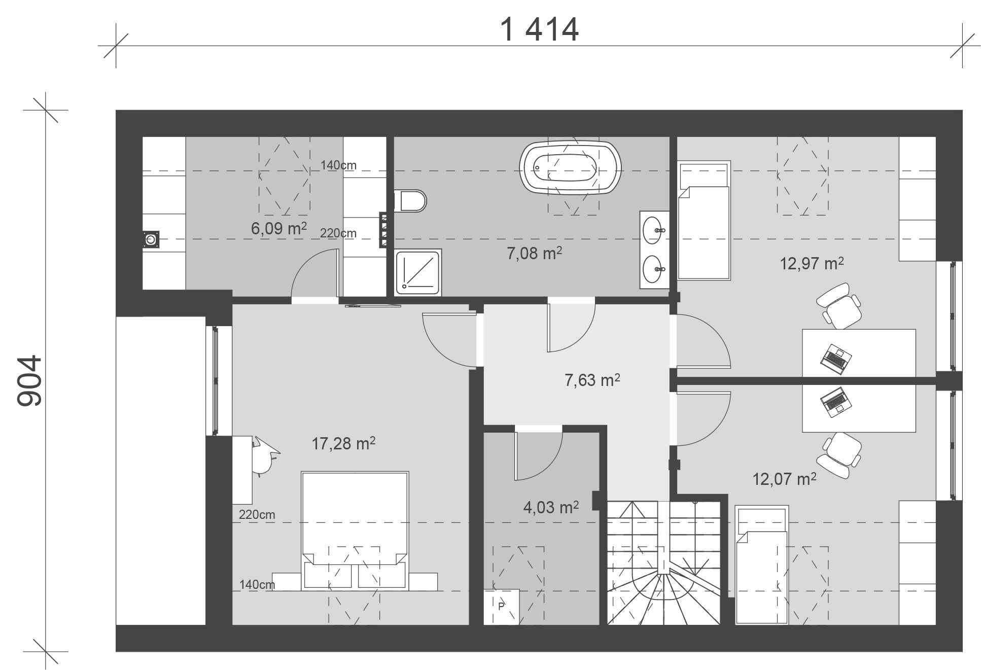 Projekt domu uA34 to klasyczny dom z dwuspadowym dachem z bardzo optymalnie zagospodarowaną przestrzenią wewnątrz. Posiada on dwustanowiskowy garaż z dostępem do dwóch pomieszczeń gospodarczych. Wchodzimy do domu przez niewielki wiatrołap, pełniący funkcję ogólnodostępnej garderoby i łącznika z garażem. Na początku korytarza znajduje się mała łazienka, natomiast na jego końcu zlokalizowano gabinet, którego ściana tworzy kącik wypoczynkowy w salonie z jadalnią i otwartą kuchnią. Obok kuchni znajduje się również niewielkie pomieszczenie spiżarni, przy której zlokalizowano schody na piętro. Kondygnacja nad parterem to klasyczna strefa nocna z niewielkim korytarzem łączącym wszystkie pomieszczenia na górze. Znajdują się tu: dwie sypialnie dla dzieci, pomieszczenie pralni, obszerna łazienka i sypialnia rodziców z balkonem i prywatną garderobą. Projekt uA34 to najlepsze rozwiązanie dla ludzi ceniących komfort i najbardziej optymalne wykorzystanie przestrzeni.