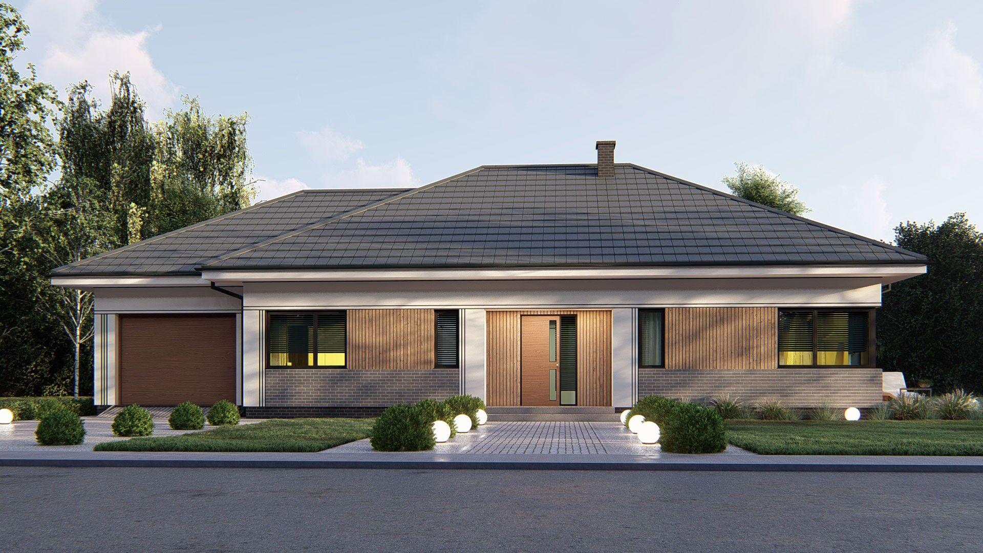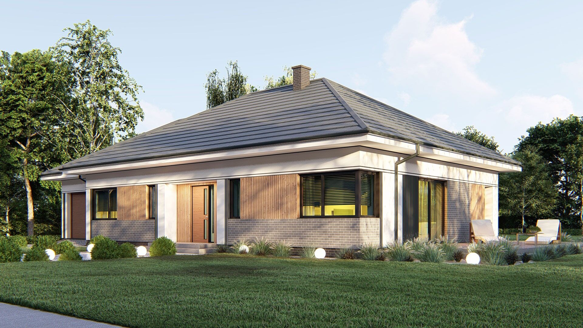 Gotowy projektu uA371 to bardzo ciekawa propozycja atrakcyjnego i przemyślanego domu parterowego o powierzchni 123 m2. Ciekawy i wygodny program funkcjonalny, a w nim w strefie dziennej wygodna kuchnia ze spiżarnią oraz salon z dostępem do tarasu oraz strefą jadalnianą. W strefie nocnej zaplanowano trzy ustawne sypialnie, w tym jedna z garderobą. Dopełnieniem programu funkcjonalnego tego gotowego projekt domu są dwie łazienki orazpraktyczne pomieszczenie pralni. W projekcie zaplanowano także garaż jednostanowiskowy z pomieszczeniem gospodarczym. Prosta bryła uA371 z piękna elewacją zewnętrzną to godna uwagi opcja ciekawego gotowego projektu domu dla rodziny czteroosobowej.