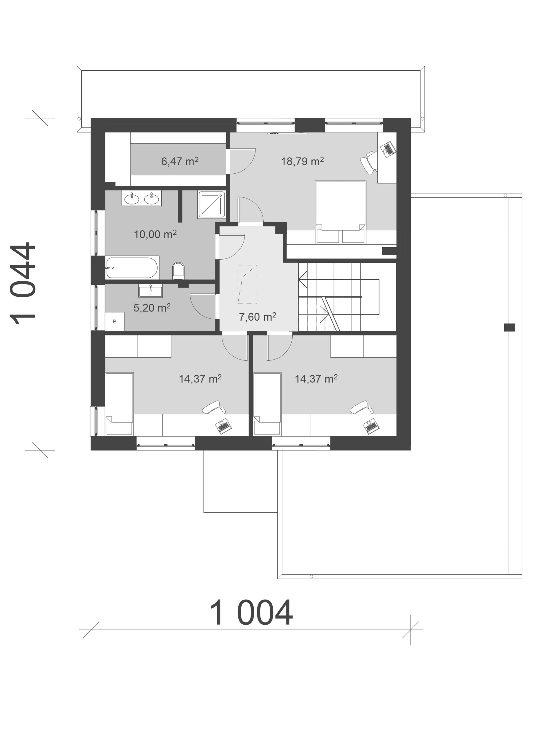 Gotowy projekt domu uA41v4 jest to propozycja funkcjonalnego i nowoczesnego domu z pełnym piętrem i garażem na dwa auta o powierzchni użytkowej 152 m2. Projekt ten doskonale sprawdzi się w zabudowie bliźniaczej jak i jako wolnostojący budynek. Ciekawa boniowania elewacja, połączenie bieli oraz drewnianych elementów dodają temu projektowi stylu i elegancji. Bryła garażu z pomieszczeniem gospodarczym została wysunięta do przodu w stosunku do reszty domu oraz połączona z przejściem z częścią mieszkalną domu. Do środka domu zaprasza reprezentacyjna, zadaszona strefa wejściowa, która prowadzi do sporych rozmiarów wiatrołapu. Na parterze w strefie dziennej zaprojektowano jasny salon z jadalnią z wyjściem na taras na tyłach domu. Obok salonu znajduje się funkcjonalna kuchnia. Na tej kondygnacji zaplanowano również dodatkowy pokój, który służyć może jako gabinet, łazienkę z prysznicem oraz niewielką spiżarnię – schowek pod schodami. Na piętrze znajdują się trzy sypialnie: jedna główna o powierzchni 19 m2 z garderobą oraz dwie nieco mniejsze sypialnie dzieci. Ponadto na tej kondygnacji mieści się komfortowa, ogólnodostępna łazienka oraz odrębna pralnia. Ten wygodny w mieszkaniu projekt występuję również w wariantach: uA41, uA41v1, uA41v2 oraz uA41v3. Poszczególne warianty różnią się od siebie niewielkimi zmianami w układach funkcjonalnych, powierzchnią całkowitą oraz elewacją.