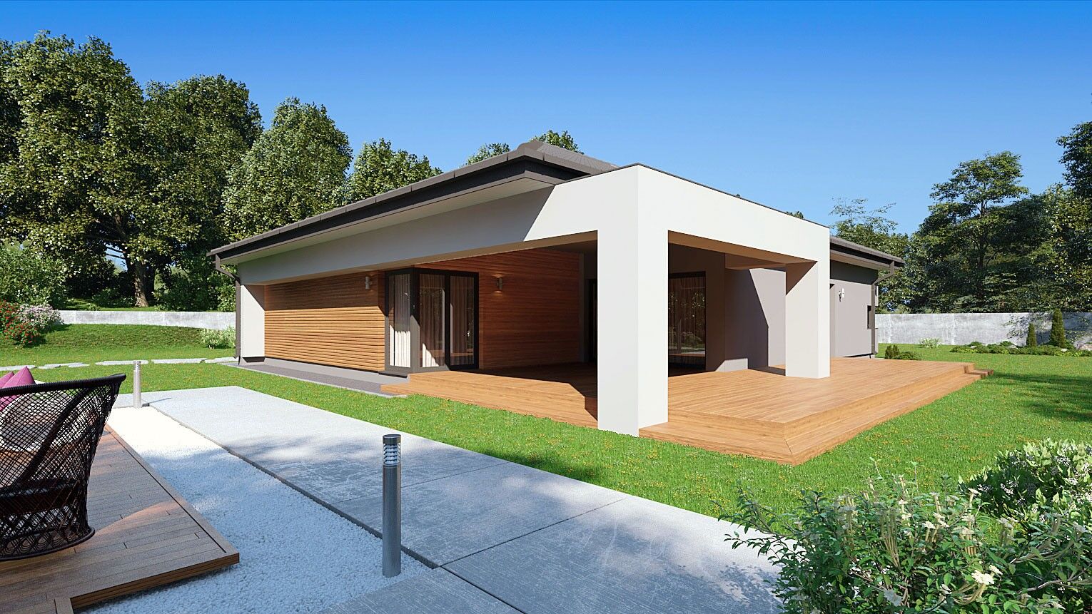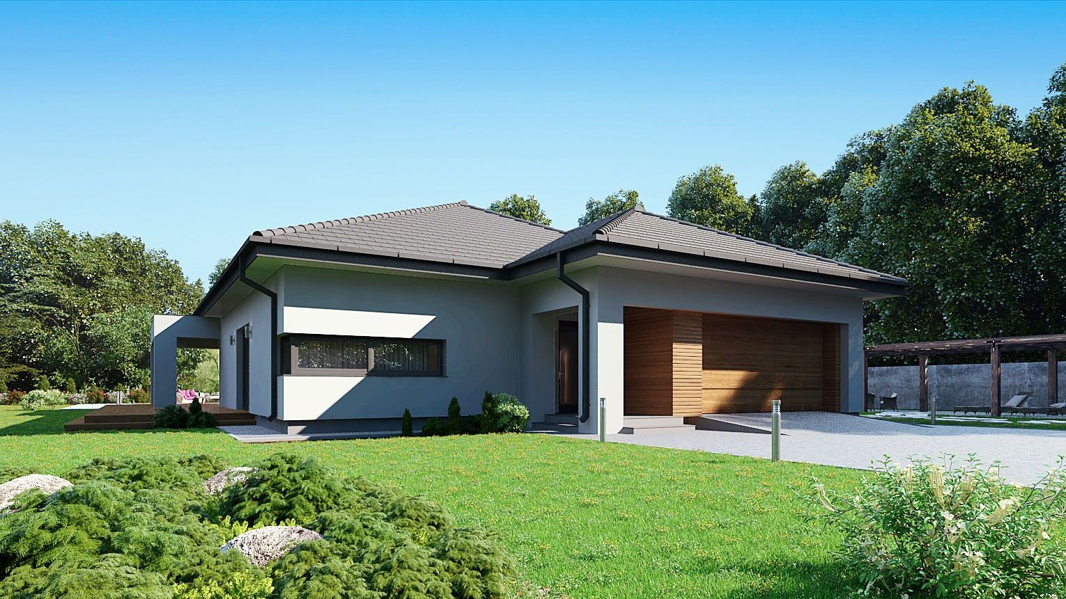 Gotowy projekt domu uA46v3 jest to propozycja wygodnego w mieszkaniu, parterowego projektu domu z ciekawą elewacja zewnętrzną, na której króluje drewno. W bryle zaplanowano dwustanowiskowy garaż z wydzielonym pomieszczeniem gospodarczym. W projekcie tym część garażowa połączona została przejściem z częścią mieszkalną. Do środka domu dostajemy się zadaszonym wejściem, które prowadzi do wiatrołapu, z wydzieloną praktyczną garderobą. Wewnętrzny układ pomieszczeń został w sposób przemyślany podzielony na strefy dzienna i nocną. Po lewej stronie znajduje się otwarta strefa dzienna, co gwarantuje poczucie przestrzeni w tym wnętrzu. Kuchnia z podłużnym, narożnym oknem będzie idealna do zaplanowania w niej modnej wyspy kuchennej. W pobliżu kuchni znajduje się niewielkich rozmiarów, jednakże niezwykle praktyczna spiżarnia. Okazały salon połączony został z jadalnią . Dzięki dużym przeszkleniom pomieszczenie to jest jasne, pełne światła i otwarte na ogród. Z salonu można dostać się na rozległy, zadaszony i reprezentacyjny taras, który będzie idealnym miejscem do organizacji letnich przyjęć w ogrodzie. Po prawej stronie domu znajduje się strefa prywatna- nocna, w skład, której wchodzą cztery sypialnie, garderoba, ogólnodostępna łazienka, toaleta oraz pralnia. Projekt uA46v1 na powierzchni użytkowej 156 m2 mieści wszystko co niezbędne do wygodnego mieszkania.
