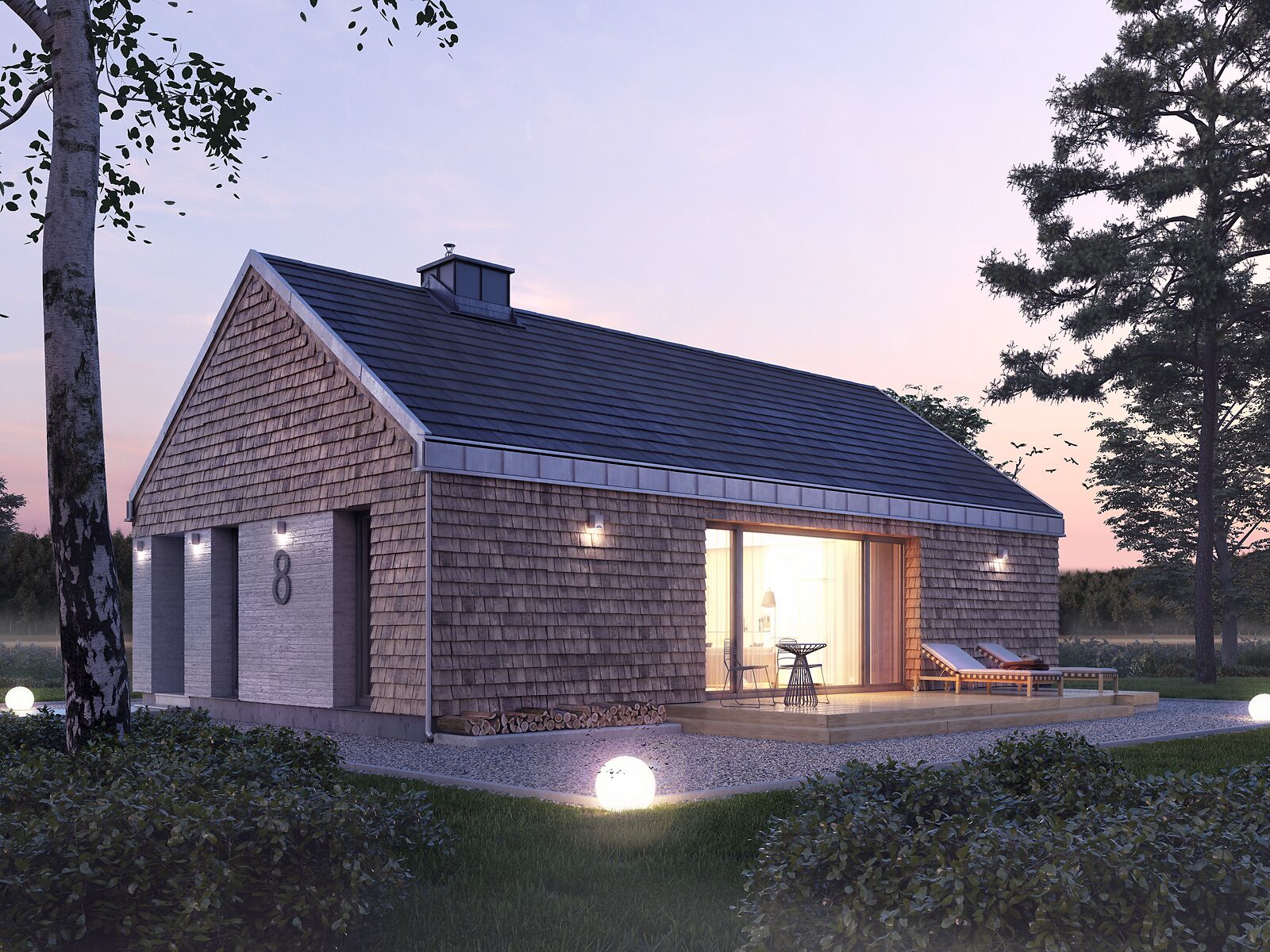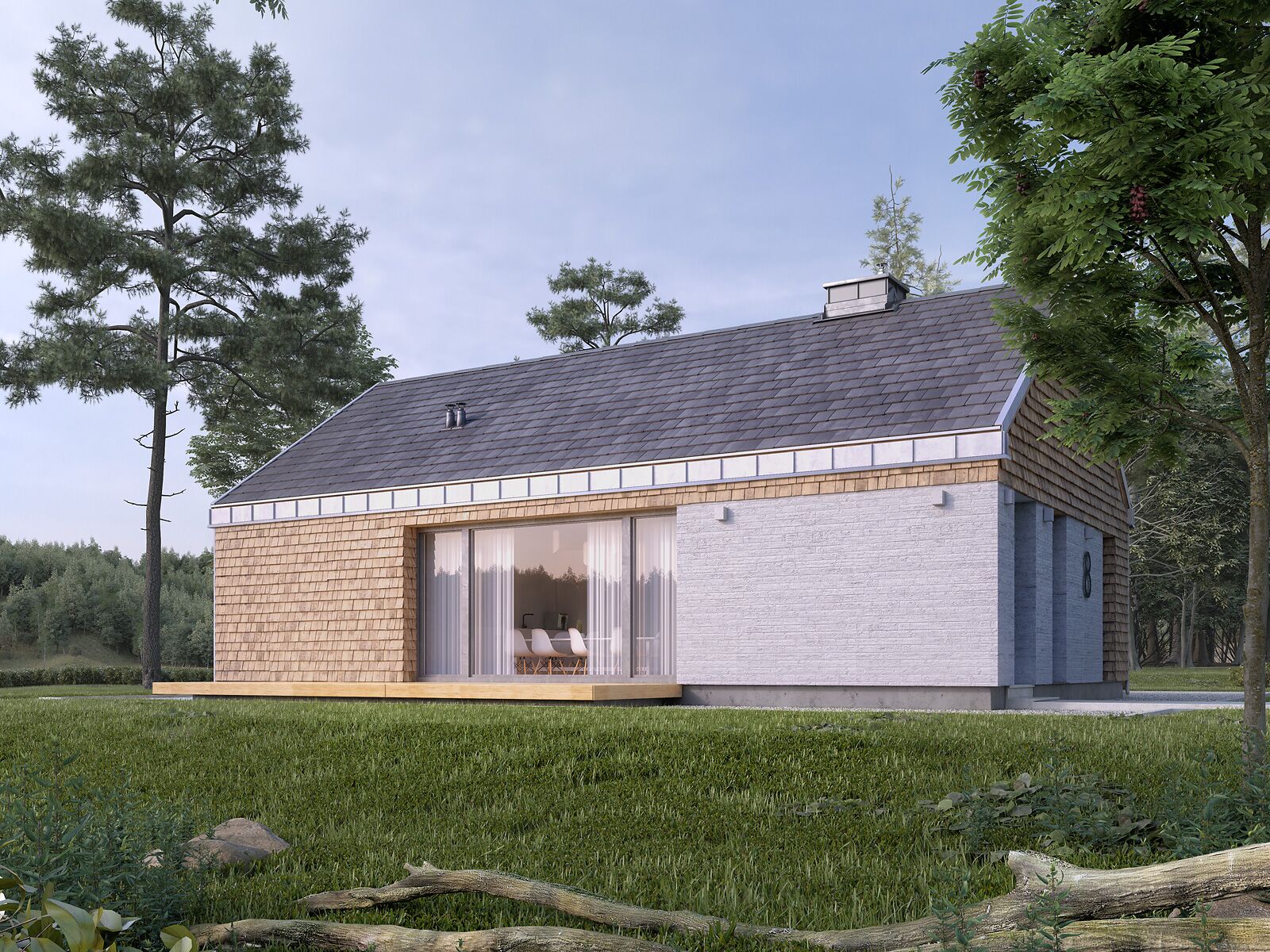 Projekt Wakacyjny to dom parterowy o charakterze wypoczynkowym. Zastosowanie dużych przeszkleń oraz naturalnych materiałów sprawiają, że dom będzie wpisywał się w otaczający krajobraz. W domu znajduje się otwarta kuchnia wraz z jadalnią i salonem. Zaprojektowano również niewielki wiatrołap oraz łazienkę z miejscem na piec gazowy. Dom może pełnić funkcję letniskową oraz całoroczną.