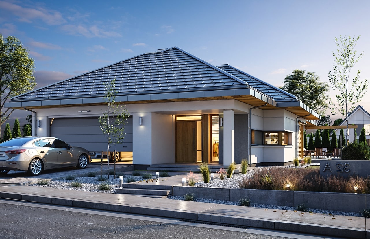 Projekt domu Wąski ma dość prostą bryłę, zorganizowaną na planie prostokąta, przykrytą czterospadowym dachem z niewielkimi dobudówkami. Architektura projektu domku Wąski jest nowoczesna. Dzięki dużym przeszkleniom, uzyskano atrakcyjny estetycznie budynek. Wejście do domu Wąski zaakcentowano podcieniem i reprezentacyjnymi drzwiami wejściowymi. W gotowym projekcie domku Wąski elewacje boczna i tylna mają z kolei największe przeszklenia z części dziennej, dzięki czemu taras stanowi idealne przedłużenie salonu. Masywny dach nad całością parteru nadaje budynkowi stylu i elegancji. Detale takie jak narożne podłużne okno kuchenne zaprojektowane między szafkami kuchennymi podkreślają nowoczesny styl domostwa. Ten projekt domu ma także duży, dwustanowiskowy garaż.