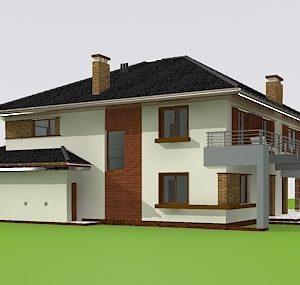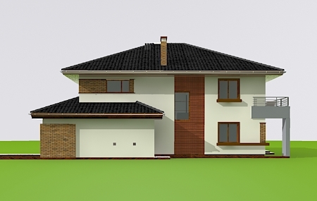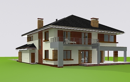 Projekt domu Wiola to budynek jednorodzinny dla 5- 6-osobowej, dużej rodziny. Piętrowy przykryty czterospadowym łagodnym dachem z dachówki ceramicznej. Wygląd zewnętrzny domu utrzymany jest w stylu podmiejskiej luksusowej willi – nowoczesnej, ale jednocześnie z elementami tradycji. Wnętrze domu ukształtowano z podziałem na część ogólną, dzienną na parterze, z salonem, jadalnią, półotwartym holem z pięknymi schodami, oraz część prywatną, nocną – na piętrze, z czterema sypialniami i dodatkowym pokojem. W projekcie domu Wiola sypialnia rodziców stanowi osobny apartament z własną oddzielną łazienką i garderobą. Na parterze, oprócz części dziennej salonu, jadalni i holu zaprojektowano gabinet i dodatkowy pokój – sypialnię gościnną. Z salonu i jadalni zaplanowano szerokie przeszklone otwarcia na ogród, przez dwa niezależne tarasy, podcień oraz pergolę. Pracownia posiada projekt domu Wiola również w odbiciu lustrzanym.