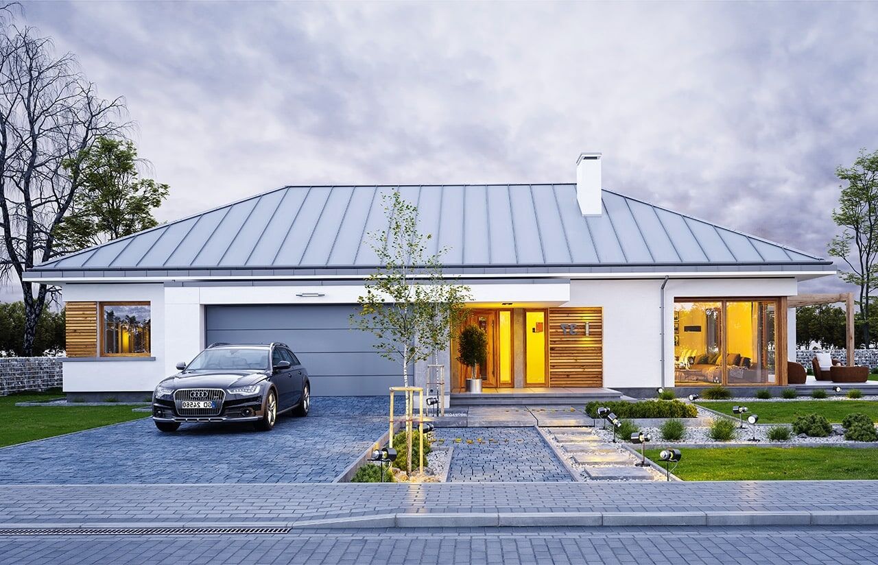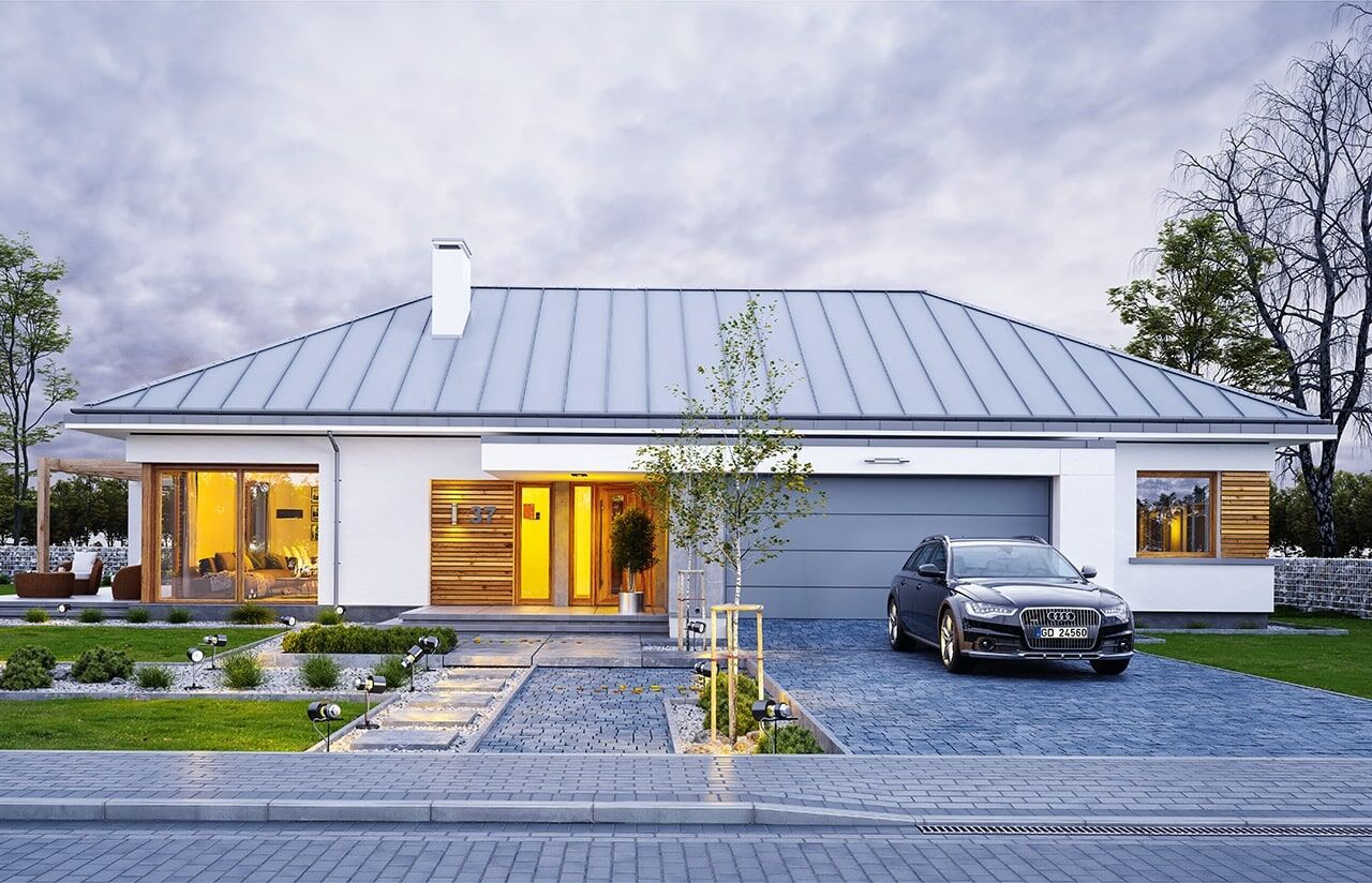 Projekt domu Wymarzony 2 to kolejny projekt z serii naszych domków „Wymarzonych”, parterowy budynek, zbudowany na planie prostokąta, przykryty czterospadowym dachem o kącie nachylenia 30 stopni. Projekt domu Wymarzony 2 łączy prostota konstrukcji i bryły, z ciekawymi detalami i rozwiązaniami architektonicznymi, tworzącymi nietuzinkowy i oryginalny efekt. Nowoczesną stylistykę projektu, uzyskano przez odpowiedni dobór materiałów, okładzin, zastosowanie dużych przeszkleń, otwierających wnętrze na otaczający ogród. Głównymi elementami nadającymi charakter bryle są : wystający przed ścianę frontową garaż z zadaszeniem nad podcieniem wejściowym, pięknie zaakcentowane drzwi wejściowe z naświetlami, oraz część tarasowa przedłużająca salon, która dzięki lokalizacji z boku budynku sprawia, że dom nadaje się doskonale na różne działki – także te z wjazdem od południa. Salon w „Wymarzonym 2” jest oświetlony z trzech stron, zatem budynek można lokalizować na działce z ogródkiem z boku albo z tyłu, a nawet od frontu domu, w narożniku działki. Wnętrze : Oryginalna lokalizacja garażu, w centralnej części bryły, daje łatwy dostęp między garażem, przedsionkiem i kotłownią, co jest rzadko spotykane w domach parterowych o prostokątnym kształcie (przeważnie garaż jest odcięty od bryły, lub znajduje się za sypialniami). Tutaj garaż jest w idealnym miejscu – przy wejściu, blisko holu i kuchni. Kotłownia obok salonu i kominka sprawia, że mamy jeden wspólny komin w całym budynku. Z przedsionka wchodzimy do holu i części dziennej połączonych pomieszczeń salonu jadalni i kuchni. Kuchnia jest oddzielona od jadalni półwyspem z barkiem. Z kuchnia mamy dostęp do spiżarni, pralni i wyjścia gospodarczego na tył domu. Salon doświetlony jest z każdej strony, a przez piękne przesuwne drzwi w elewacji bocznej wychodzimy na taras częściowo przykryty pergolą. Z drugiej strony domu mamy trzy sypialnie, łazienkę i garderobę. Nad parterem zaprojektowano strop i krokwiową więźbę dachową, dzięki czemu do dyspozycji jest dodatkowy duży strych – magazyn, do dowolnej aranżacji. Na strych dostajemy się schodkami drabinkowymi z holu. Konstrukcję dachu można przeprojektować też na wiązary kratownicowe i wyłączyć tą przestrzeń z jakiegokolwiek użytkowania. Projekt domu Wymarzony 2 to komfortowa, wygodna mini-willa dla czteroosobowej rodziny – funkcjonalna, praktyczna, bez biegania po schodach. Budynek jest energooszczędny, ma prostą konstrukcję, będzie łatwy w budowie i tani w utrzymaniu. Zapraszamy do zapoznania się z pełną ofertą pracowni MG Projekt tej serii: Wymarzony, Wymarzony 3, Wymarzony 4, Wymarzony 5, Wymarzony 6, Wymarzony 7, Wymarzony 8, Wymarzony 9, Wymarzony 10, Wymarzony 11.