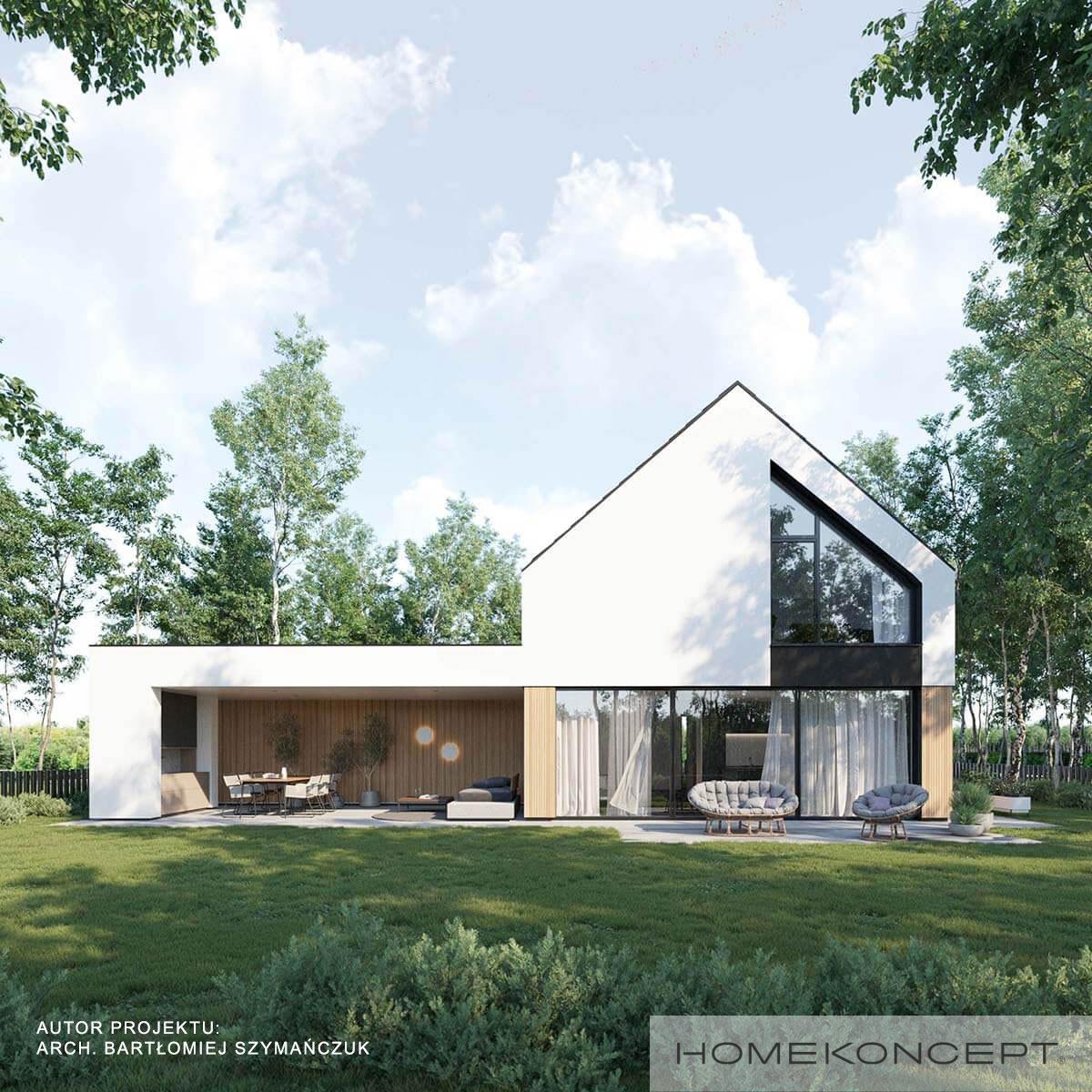 | Elewacja | tynk silikonowy w kolorze białym i grafitowym połączony z drewnem elewacyjnym |