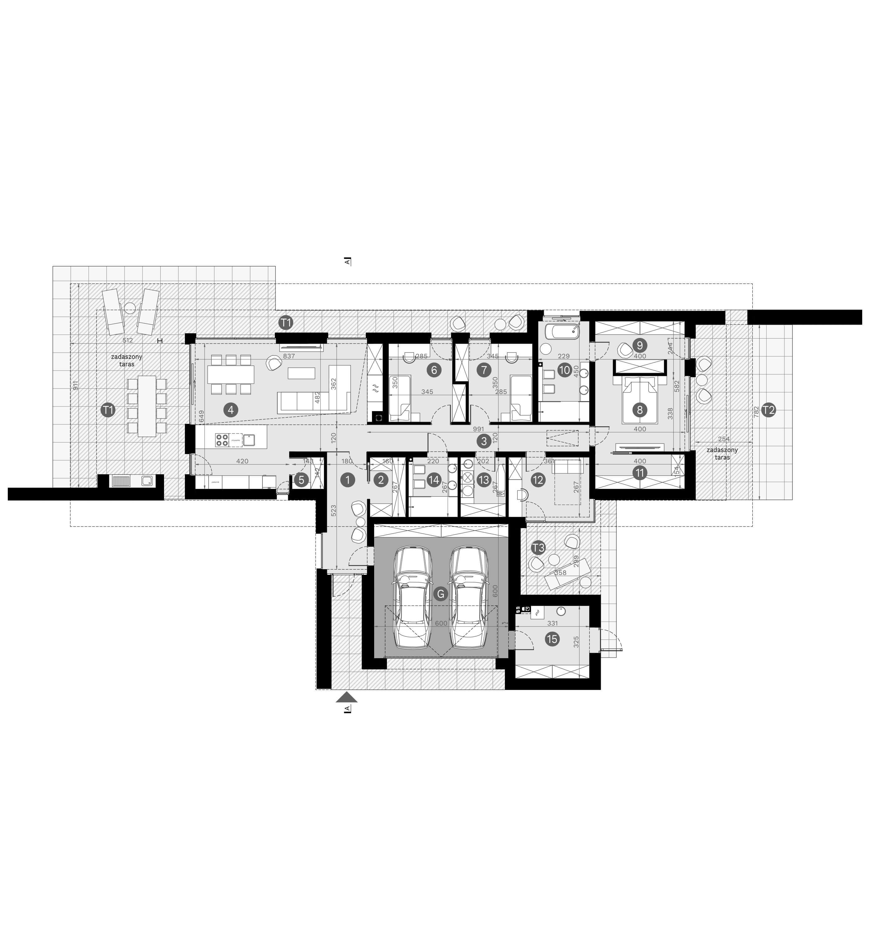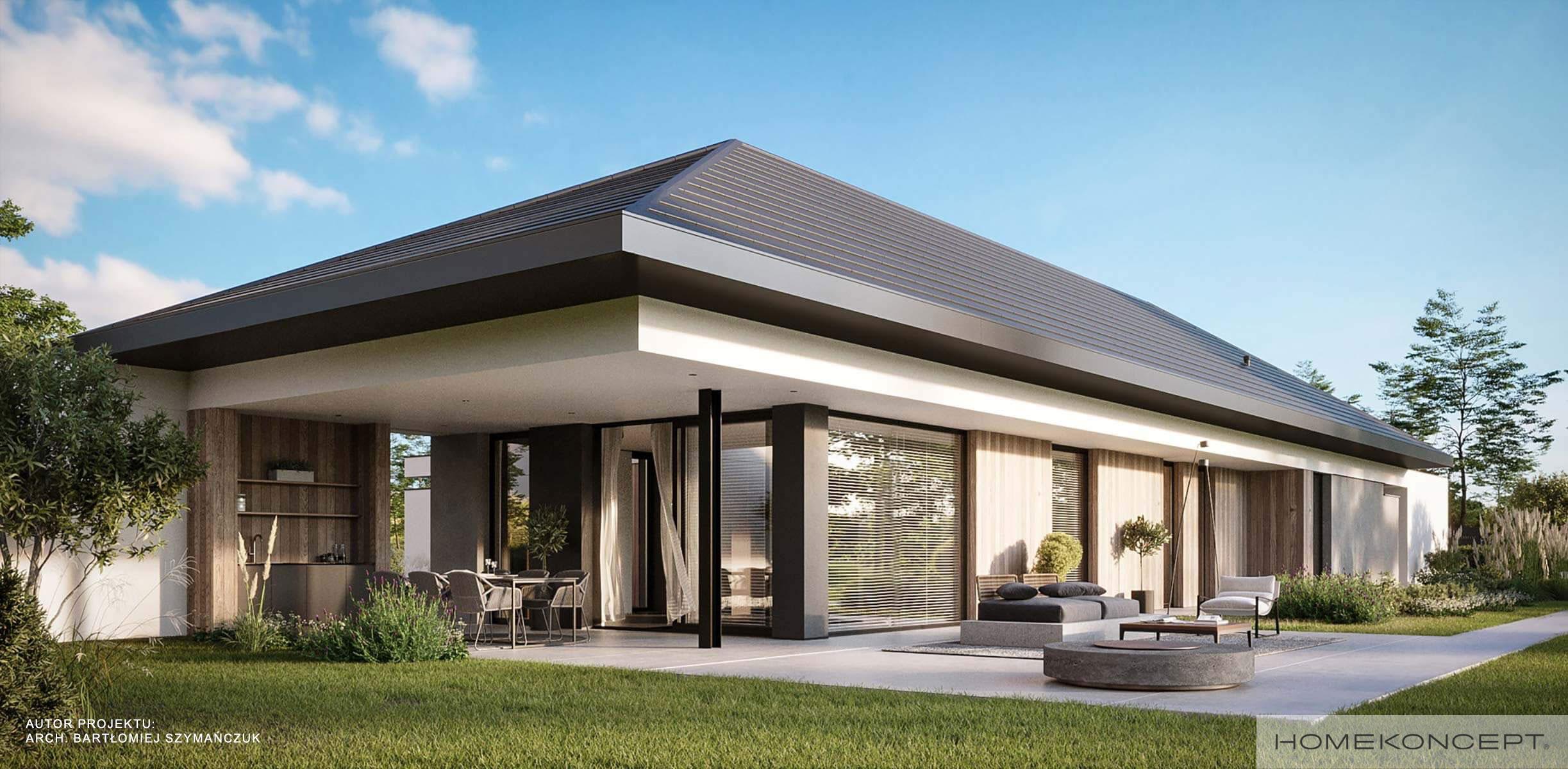 | Dach | dach czterospadowy pokryty dachówką ceramiczną lub cementową CREATON, stropodach pełny kryty membraną EPDM |