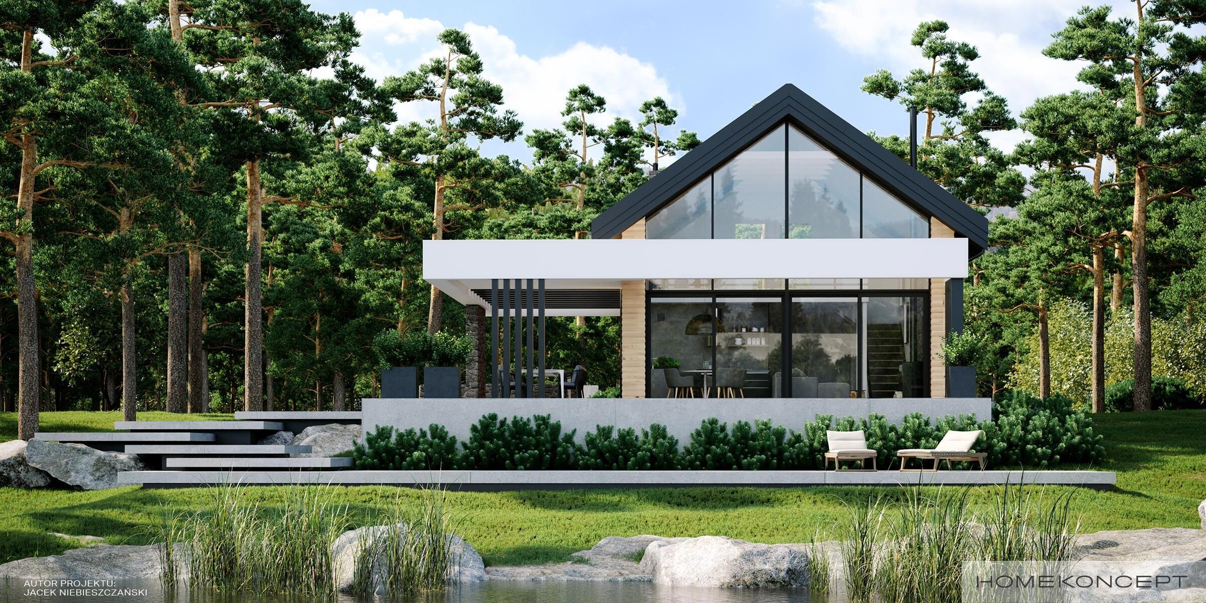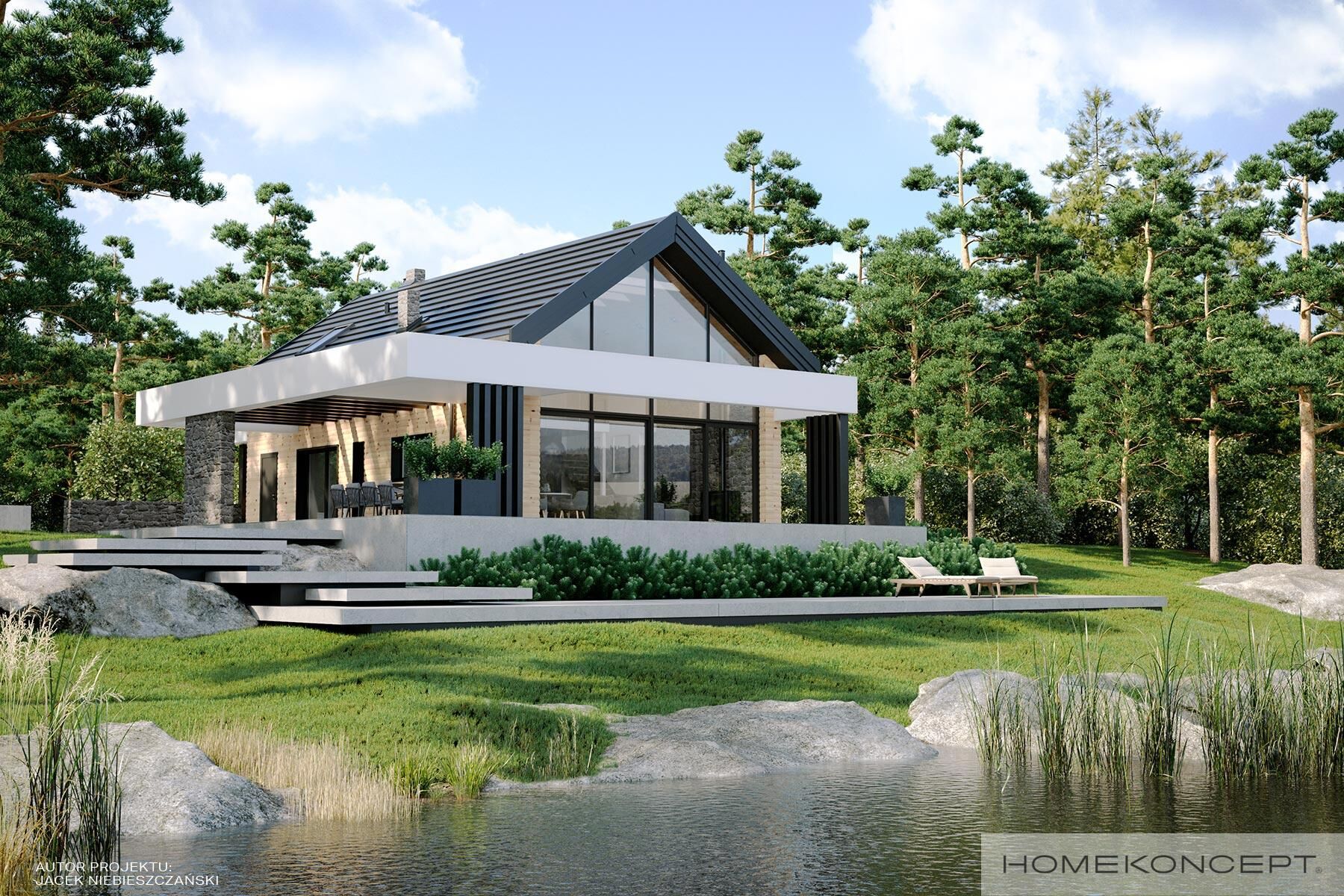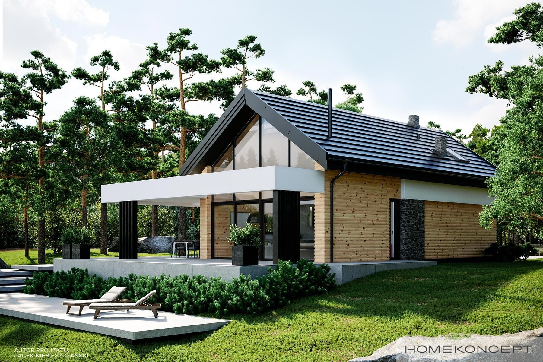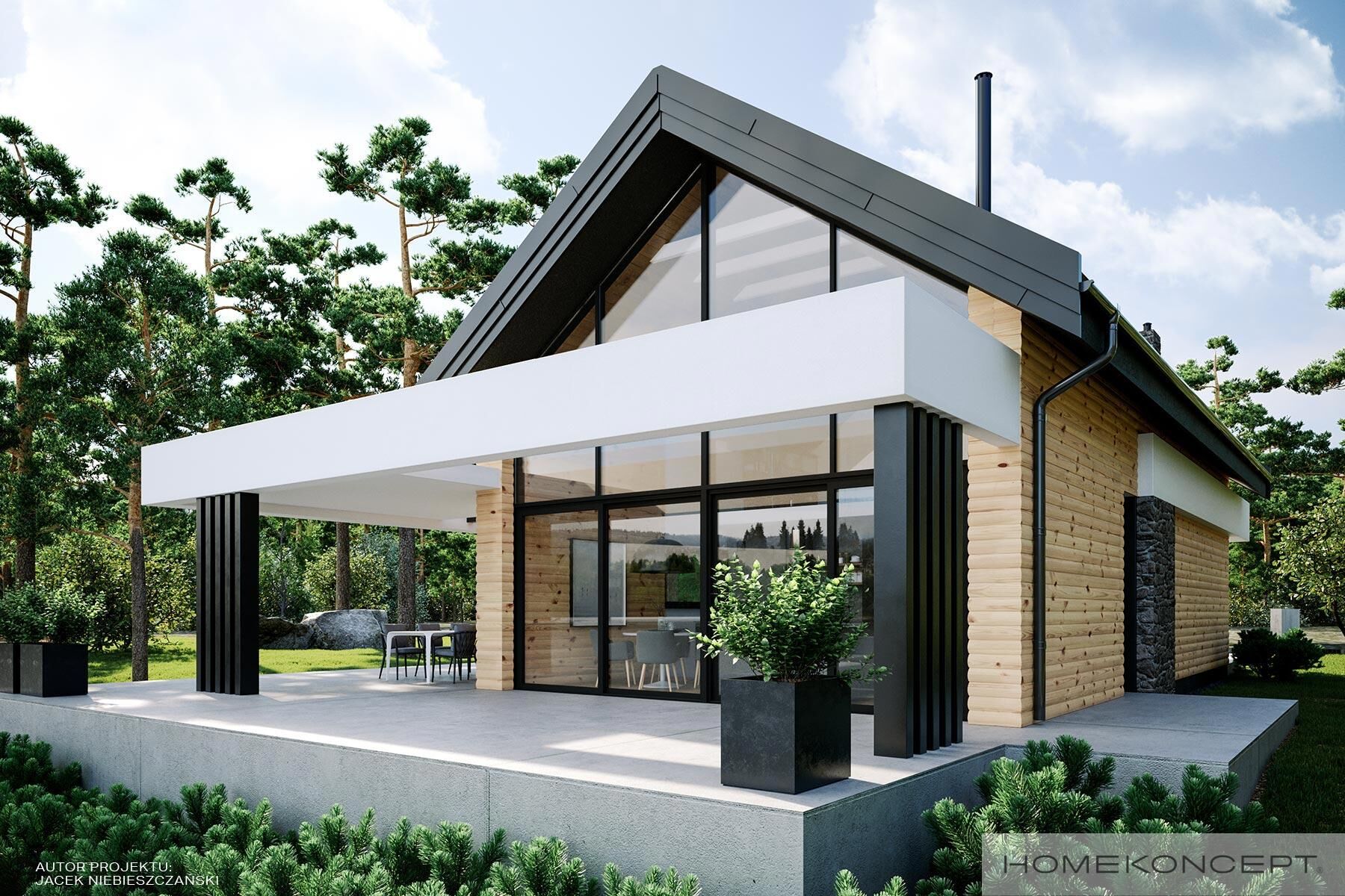 | Elewacja | deski elewacyjne/ćwierćbale połączone z kamieniem elewacyjnym 29PM firmy EL-POL Hurtownia Kamienia i tynkiem silikonowym |
